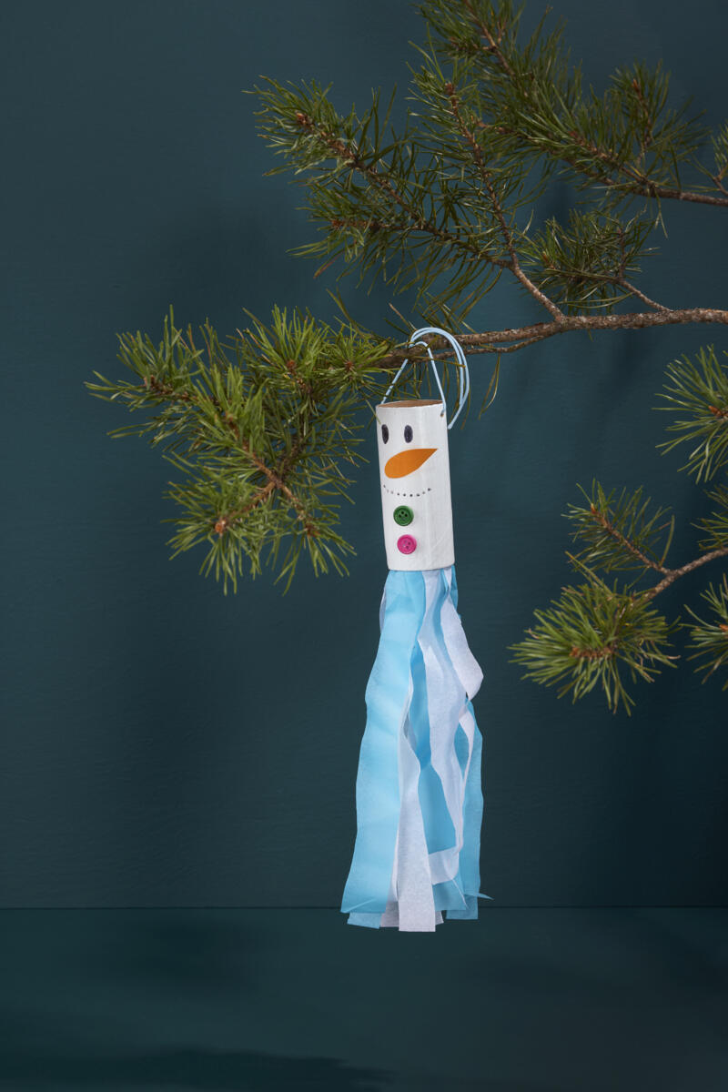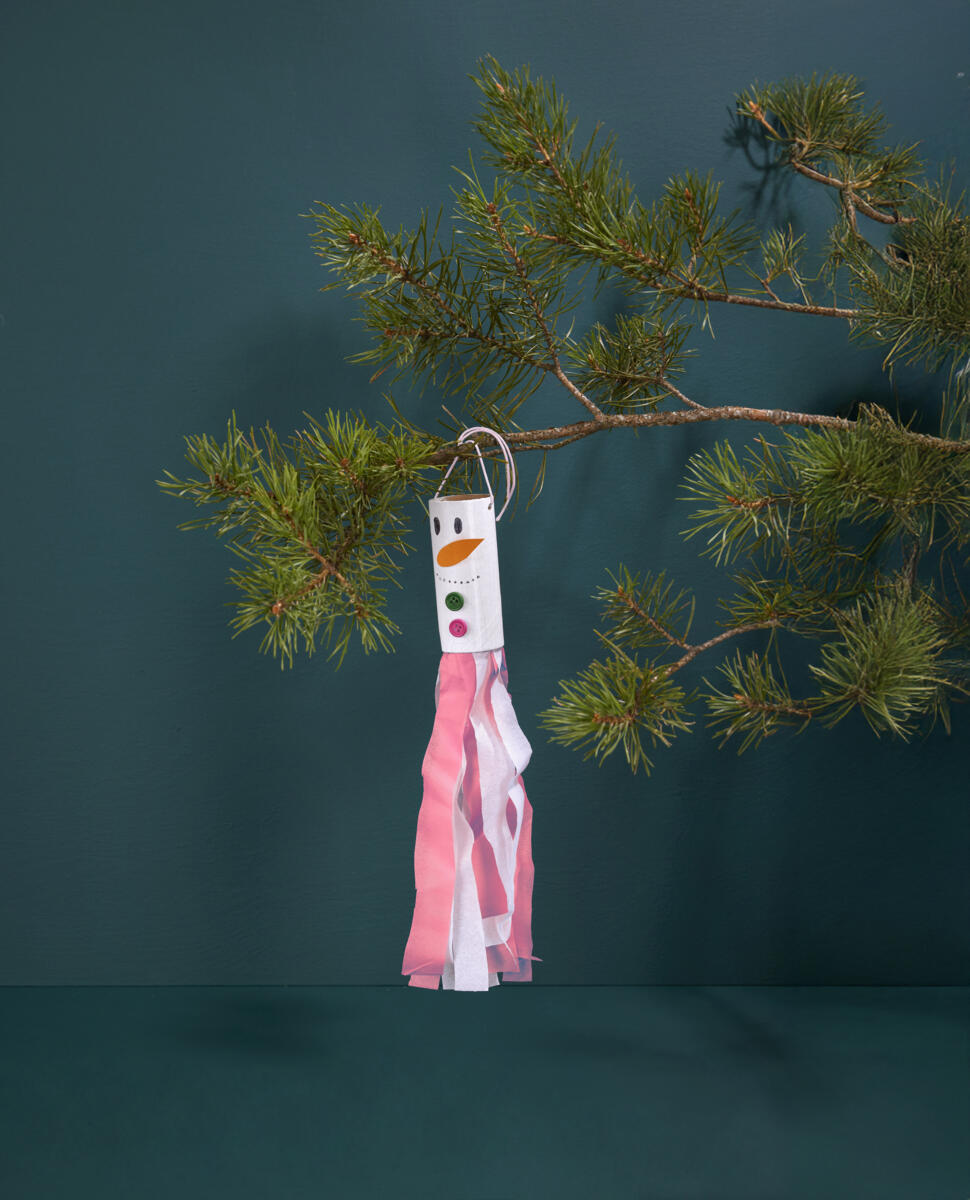 - Stansa två hål på sidorna på rullen och dra igenom ett snöre för att kunna hänga upp snögubben i t.ex. granen. Vi har stansat hål med en håltång.