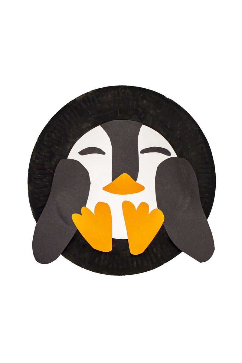 - Klipp ut pingvinens näsrygg, vingar och ögon från ett svart papper, fäst med lim.