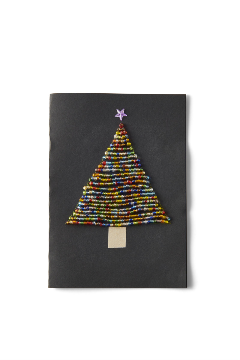 - Trä små pärlor på tråden fram till den ritade linjen och fortsätt så tills granen är helt klädd med pärlor.
