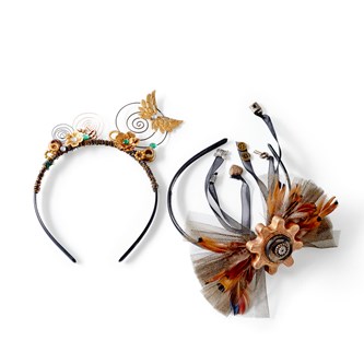- Måla kugghjul, knappar och berlocker i kopparfärg. Gör en rosett av tyllen och fäst på diademet, limma på fjädrar och sist kugghjul och knapp.