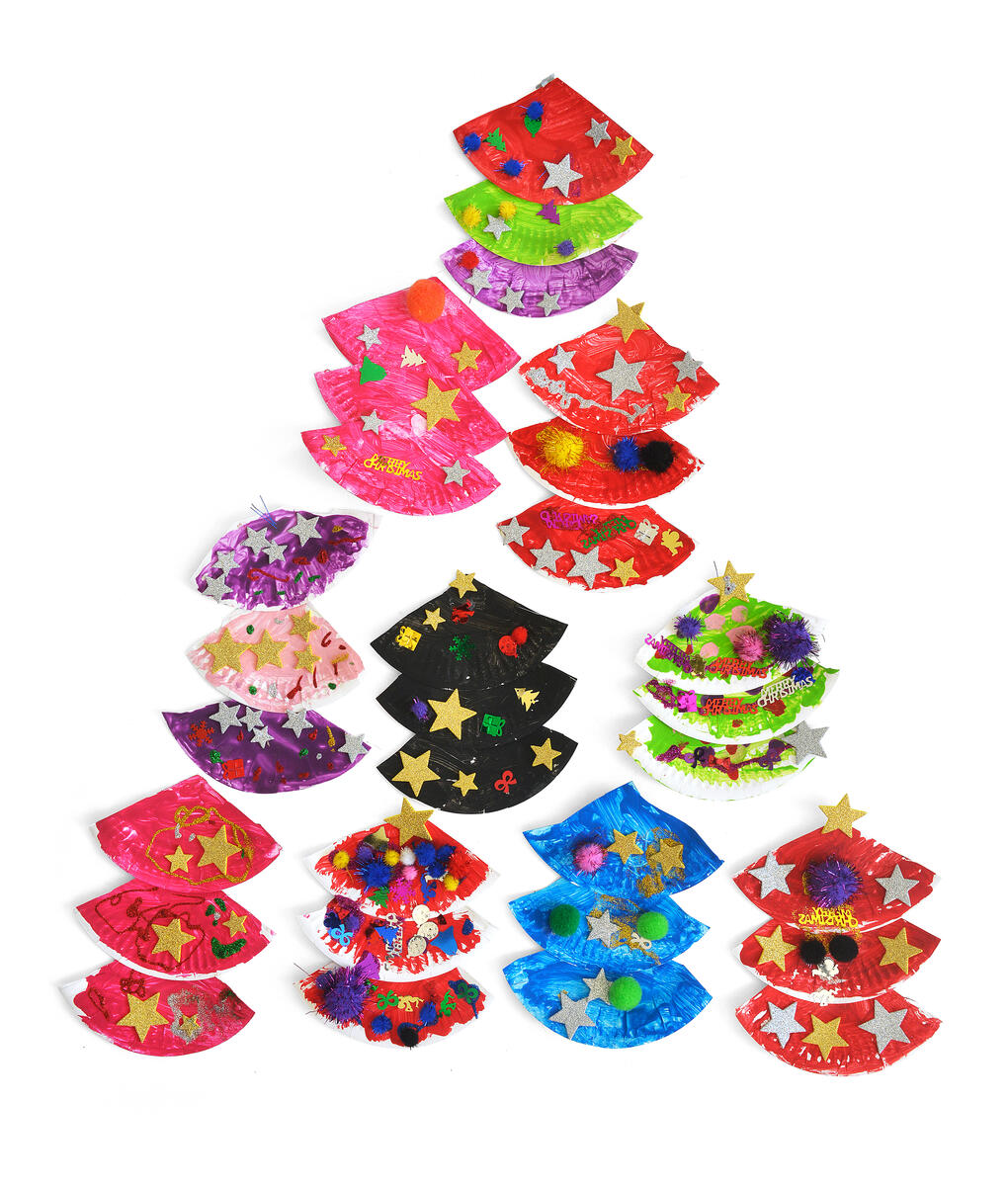 Klipp ut 3 trekanter ur papptallrikarna. En papptallrik räcker till 3 trekanter. Limma ihop trekanterna så att de bildar en gran (den runda kanten neråt).
