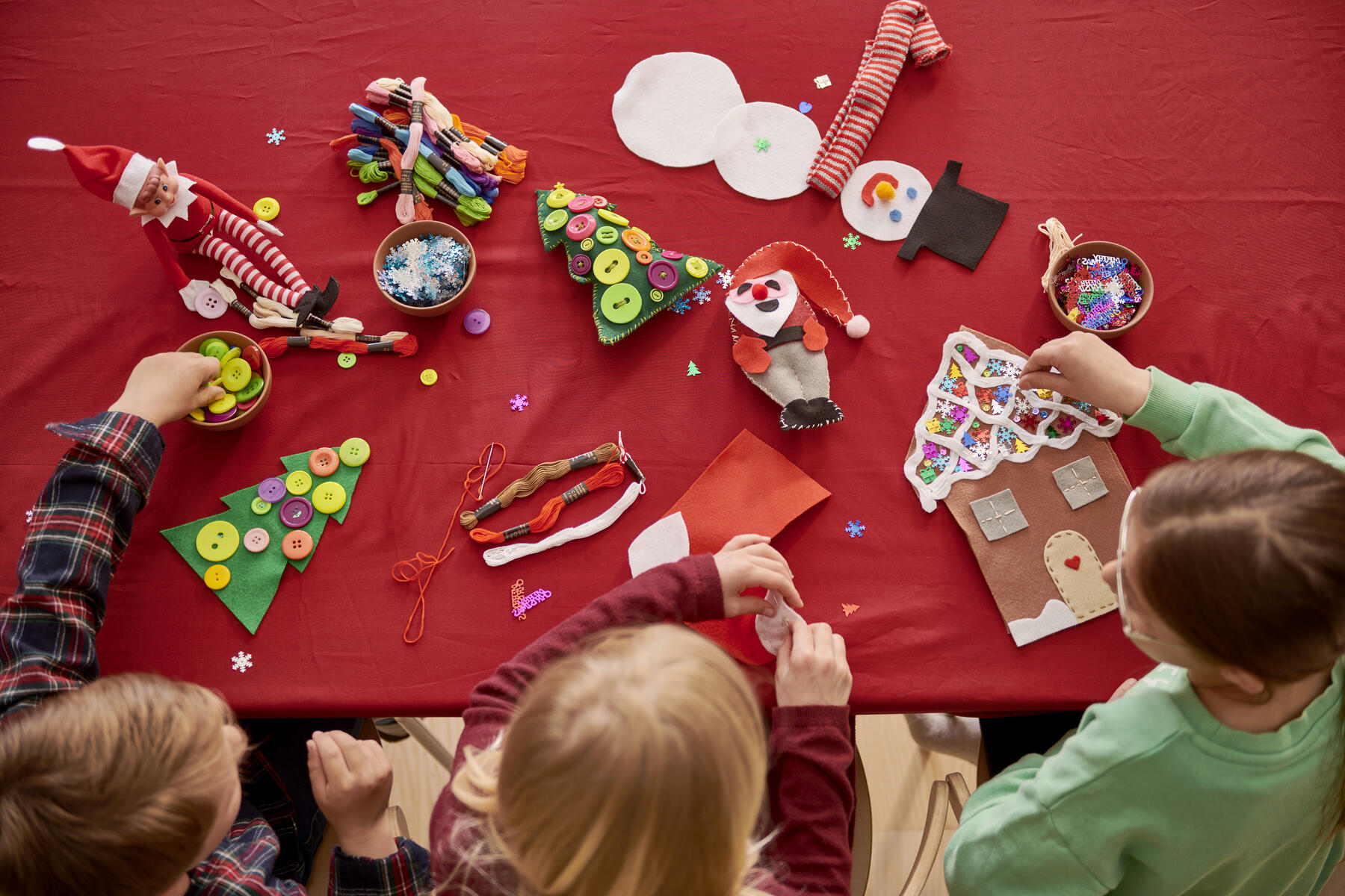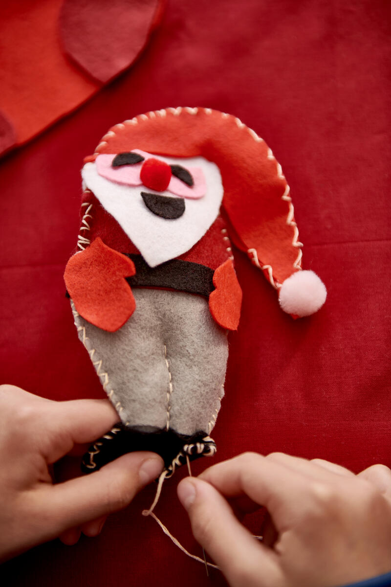 - Tomte: Gör en pappersmall för tomtens luva, överdel, byxor, bälte och skor. Nåla fast dessa på filttyg av önskade färger och klipp ut två stycken, fram- och baksida.Sy ihop framsidan och baksidan. Lämna en öppning för stoppning, fyll med vadd och sy sedan ihop sista biten. Gör pappersmallar för vantar, skägg, ögon och mun. Nåla fast på filttyg och klipp ut. Limma fast dessa delar med limpistol. Limma på en pompom som näsa och en som dekor på luvan.