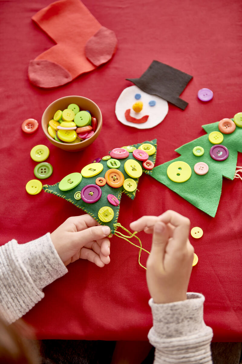 - Julgran: Gör en pappersmall för julgranen, nåla fast den på filttyget och klipp ut två stycken, fram- och baksida. Sy fast knappar i olika storlekar och färger på filten. Sy ihop framsidan och baksidan. Lämna en öppning för stoppning, fyll med vadd och sy sedan ihop sista biten.Enklare variant: att klistra fast knapparna och limma igen kanterna med limpistol.