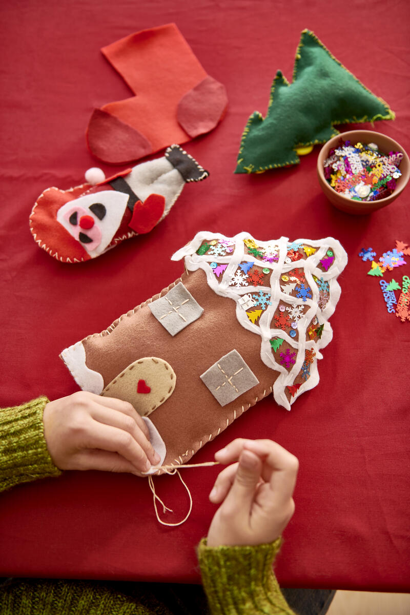 - Pepparkakshus: Rita upp formen av ett hus på dekorationstyget, klipp ut en fram- och en baksida. Klipp därefter ut dörr, fönster och snö. Dekorera husets framsida genom att sy fast dörr, fönster och snön på taket. Limma fast snö bredvid dörren och paljetter på taket, enklast är att använda limpistol. Sy ihop framsidan och baksidan, lämna en öppning för att kunna stoppa huset med vadd. När huset är stoppat, sy ihop sista biten.