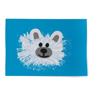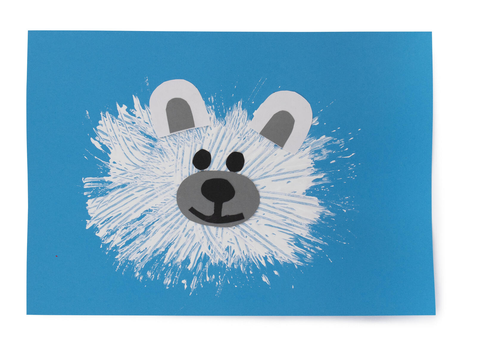 - Isbjörn – lägg en vit färgklick på papper. Stryk med gaffel utåt. Klipp ut mun, nos, mun, ögon och inneröra i papp. Limma dit.