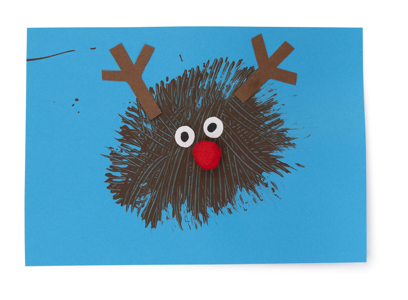 - Ren – lägg en brun färgklick på papper. För brun färg blanda röd, blå och gul. Stryk med gaffel utåt. Klipp ut ögon och horn i papp. Limma dit. Limma fast en pompom som nos.