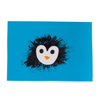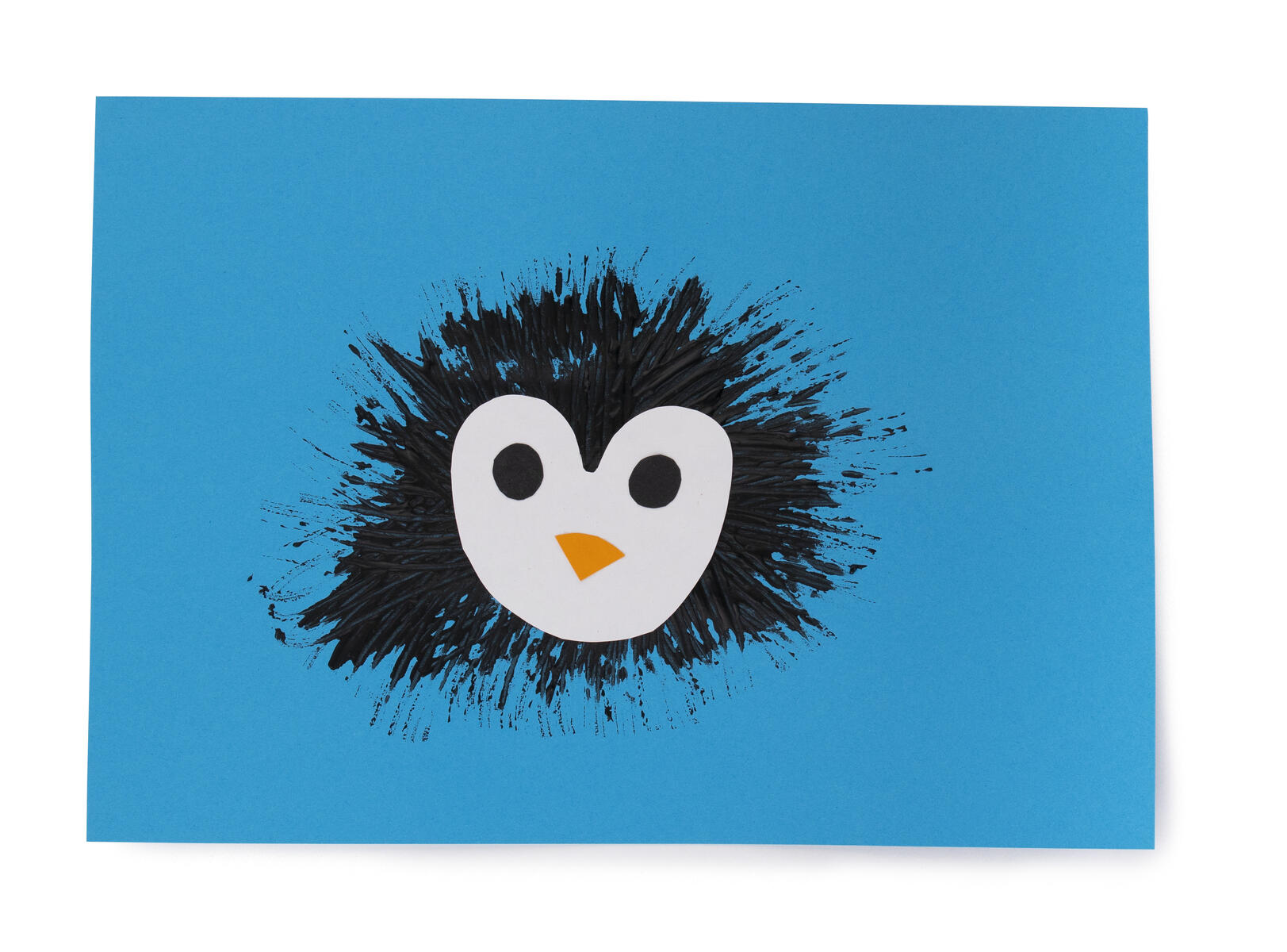 - Pingvin – lägg en svart färgklick på papper. Stryk med gaffel utåt. Klipp ut ansikte, ögon och mun i papp. Limma dit.