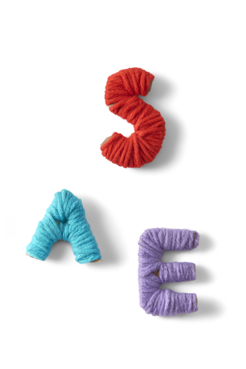 - Välj ett garn som ni fäster med lite lim eller en limpistol på bokstaven och låt barnen sedan vira garnet runt. Bokstäver med spetsiga hörn, såsom A, M, N och V, är lite extra krångliga just i spetsen och därför kan man klippa av en bit på hörnen, så blir det lättare.
