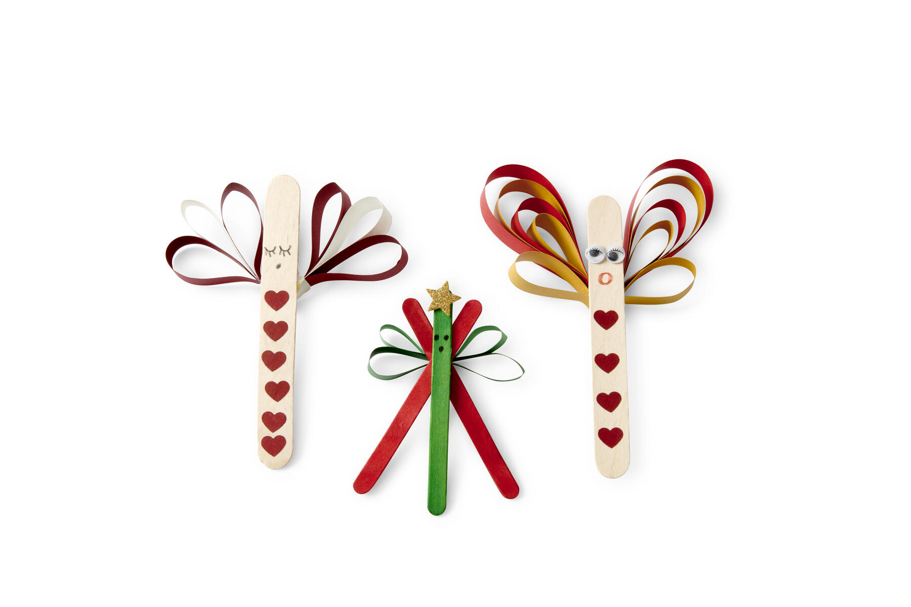 Limma två glasspinnar i kors och limma en tredje i mitten. Måla ögon och limma fast en stjärna i toppen. Vingarna görs enligt beskrivning ovan. Dock med kortare remsor av strimlapapper.