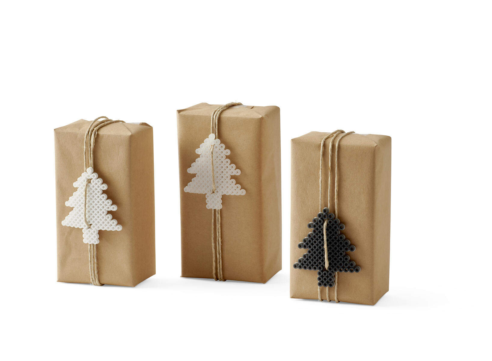 Trä sedan ett snöre/band runt paketet och trä igenom granens hål och fäst snöret på baksidan.