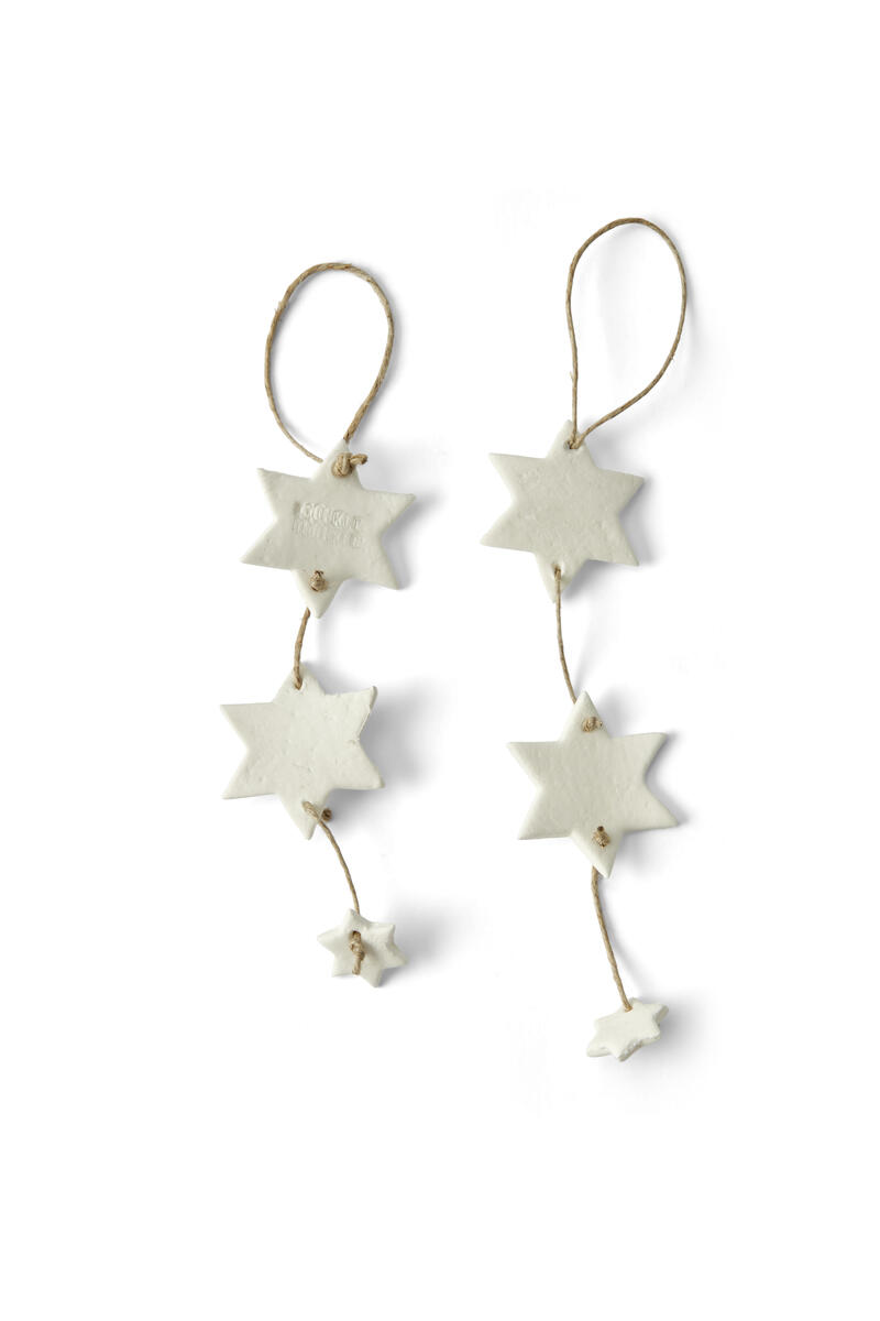Kavla lera och tryck i julform. Ta ut leran ur formen. Vid bokstäver tryck ner bokstavsstämplar till önskat ord. Gör ett hål i ovankant och underkant, se bild. Trä genom ett garn så att alstret går att hänga och är sammankopplade, se bild.