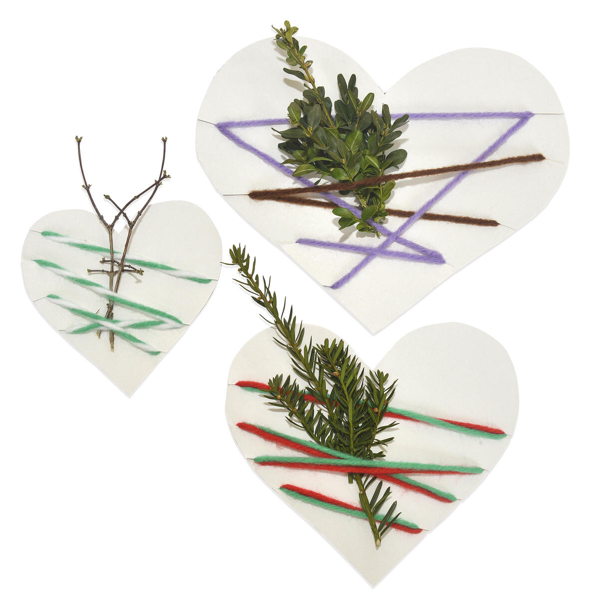 - Sätt fast grankvistar, blad eller annat från naturen i det vävda garnet.