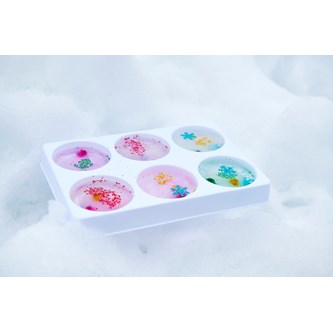 - Fyll en blandpalett med tex glitter, paljetter, små pompoms eller annat material. Fyll sedan upp paletten med vatten ( om man kokar vattnet innan, blir det mer klart ).