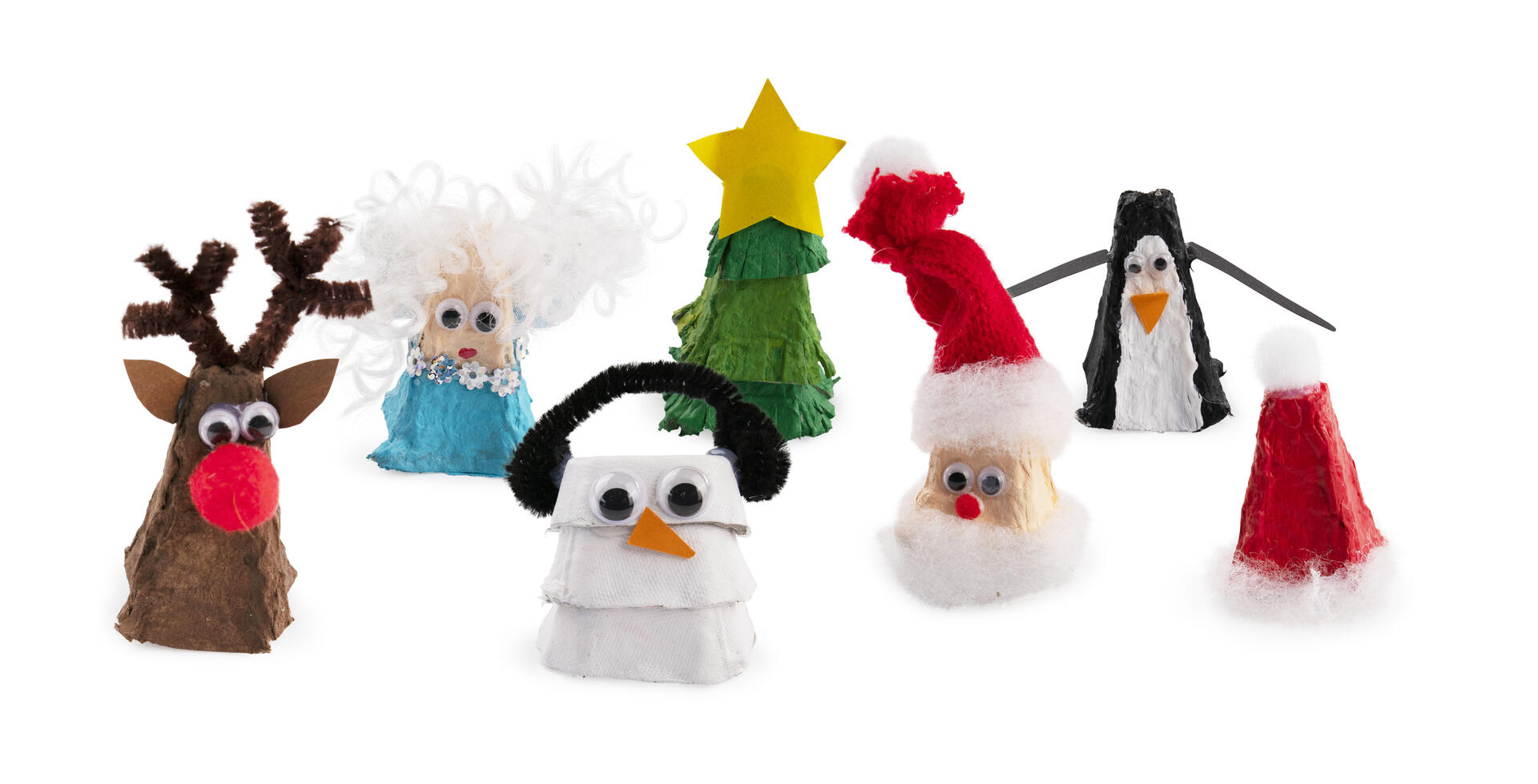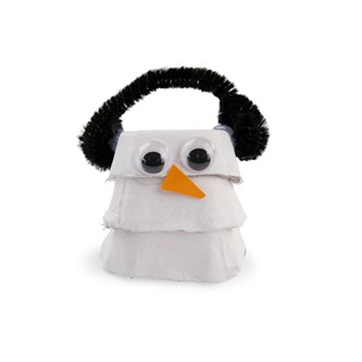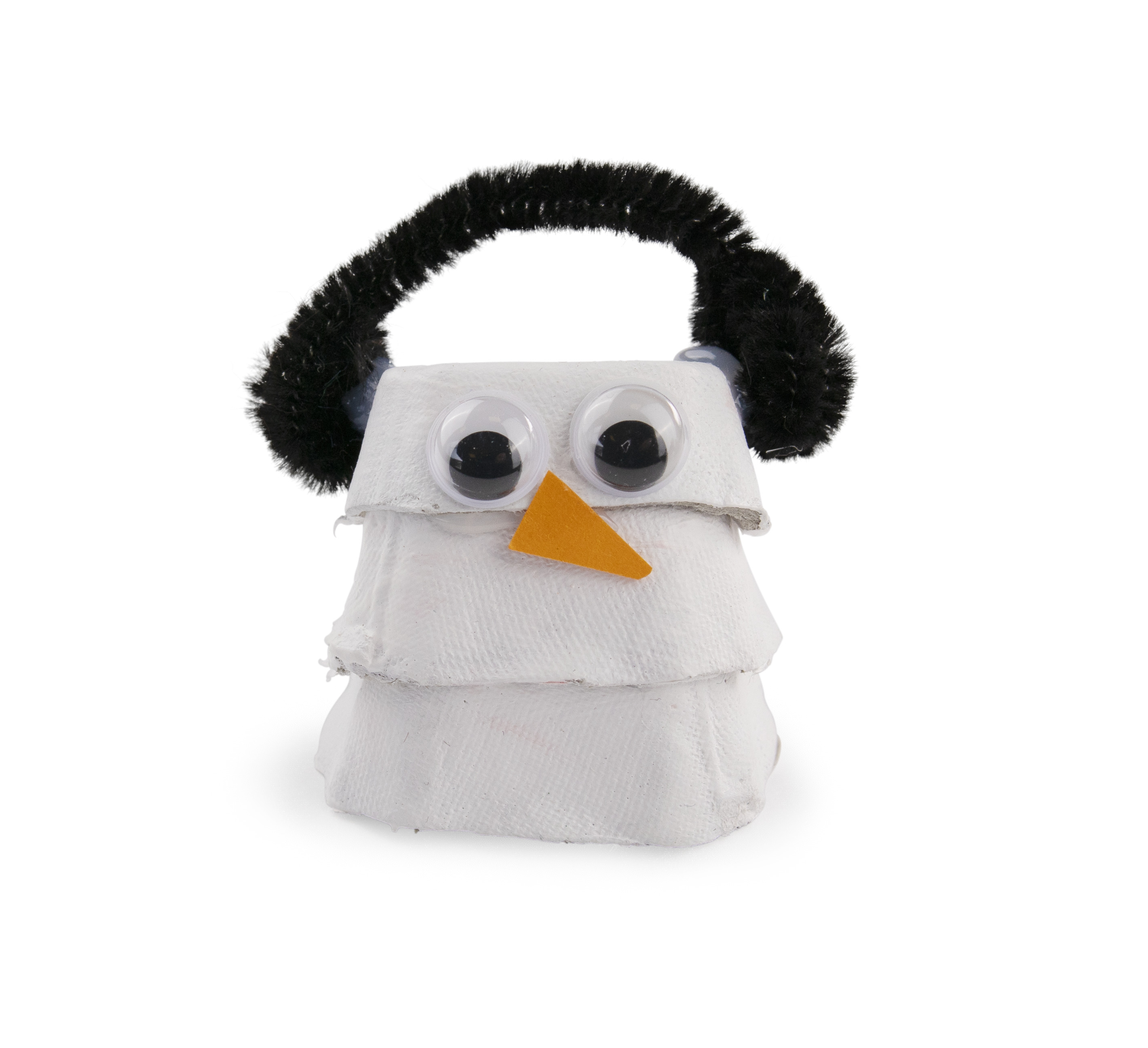 - Snögubbe – klipp ut form av äggkartong. Måla delarna vita och limma ihop. Klipp ut näbb i papp. Forma piprensare som öronmuffar. Limma dit ögon, näbb och öronmuffar.