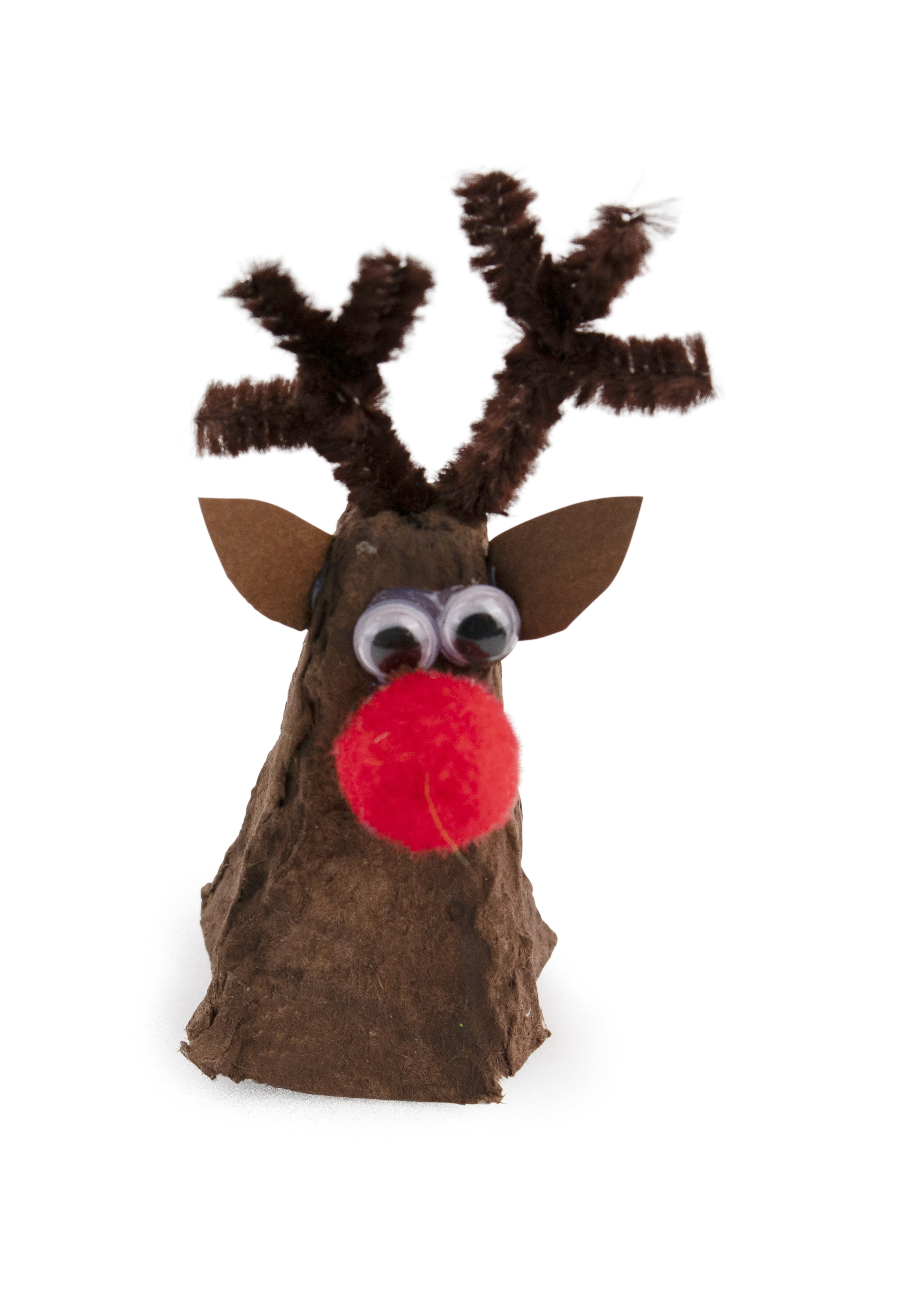 - Ren – klipp ut form av äggkartong och måla brun. För brun färg blanda rött, blått och gult. Forma horn av piprensare. Klipp ut öron i papp. Limma dit ögon, nos av pompoms, öron och horn.