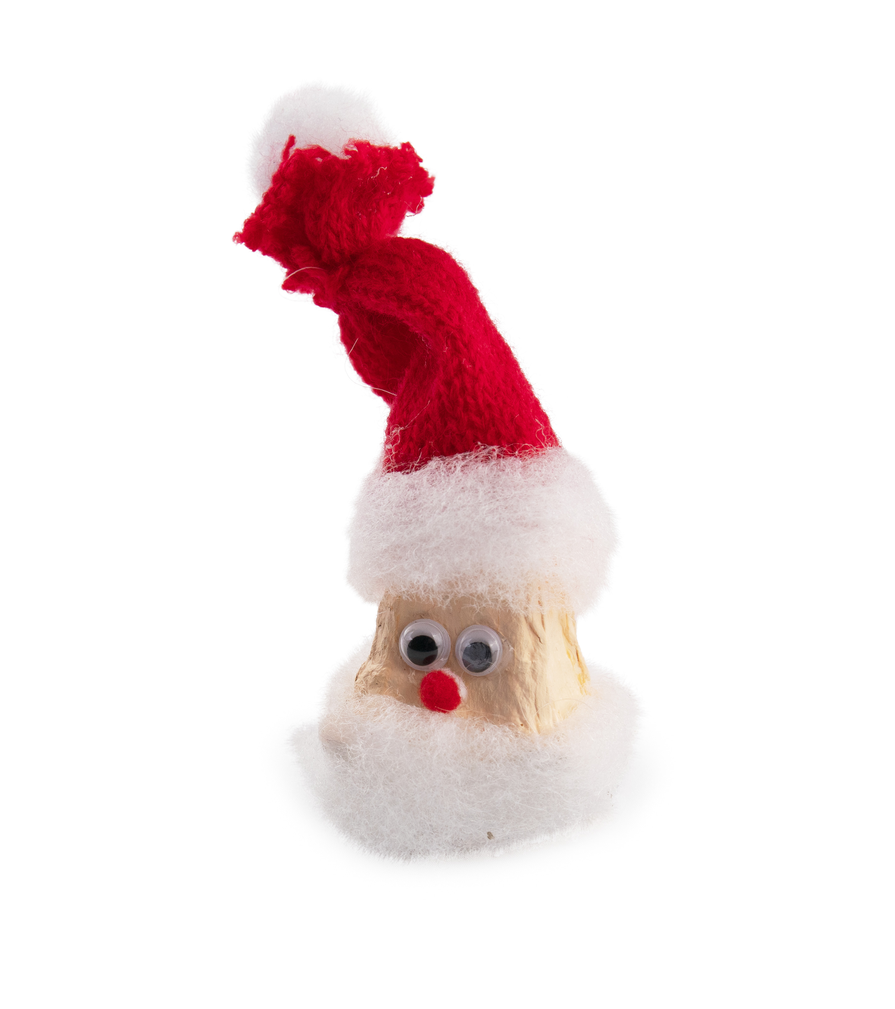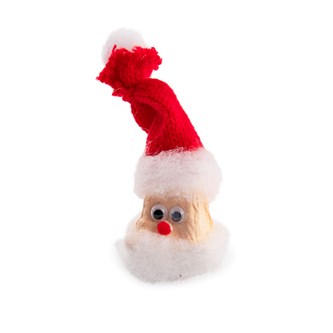 - Jultomte – klipp ut form av äggkartong. Blanda färgerna och måla hudton. Limma dit ögon och näsa av pompom. För skägg klipp och limma dit thermovadd. För luva klipp ut en del av tubstickad klädsel och limma dit. Limma en pompom på luvans topp.