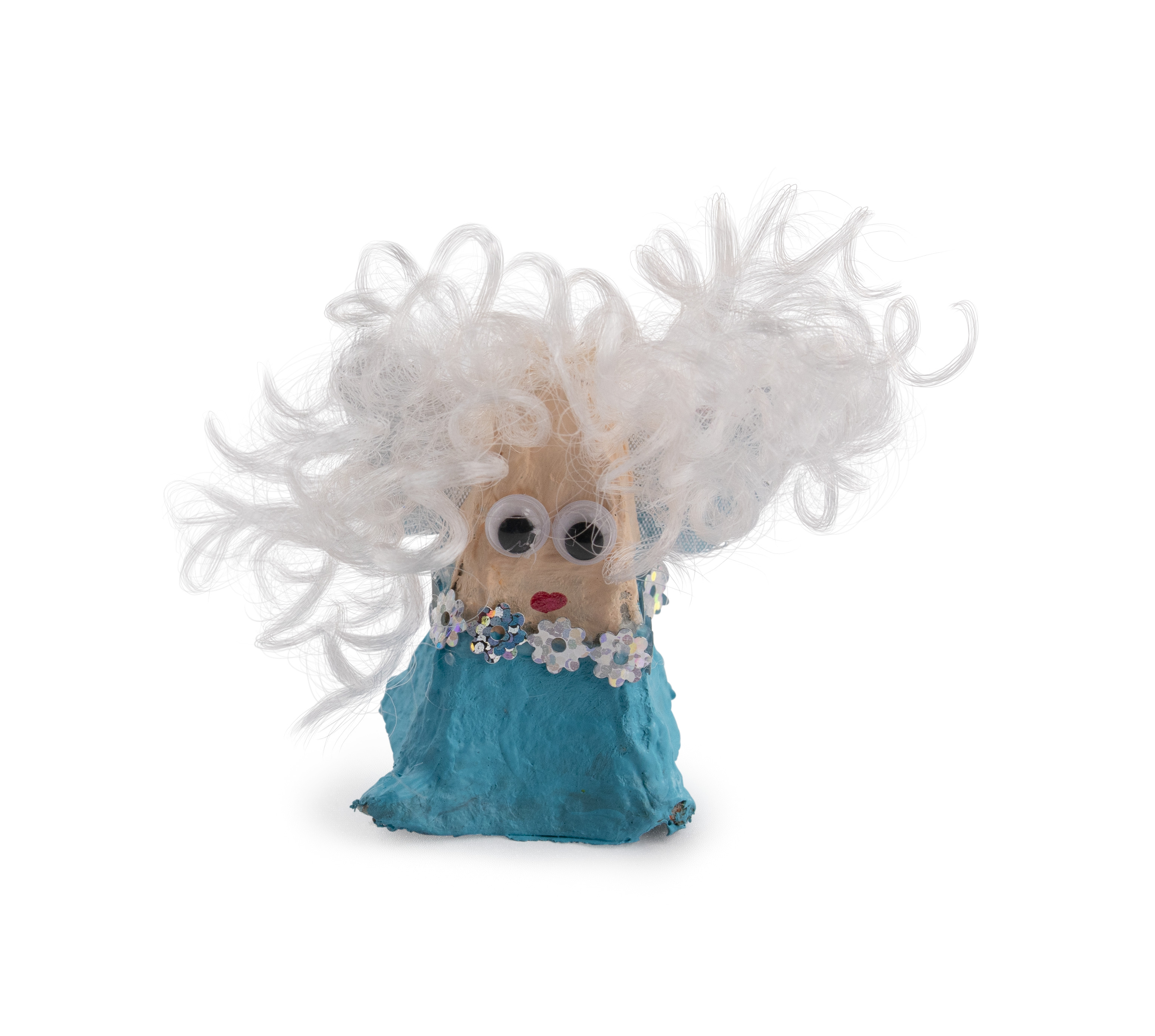 - Ängel – klipp ut form av äggkartong. Måla övre delen i hudton och nedre i blå. Blanda olika färger för att få hudton. Klipp ut en del av hår och limma på. Klipp ut paljettband och limma dit som avgränsare mellan hud och klänning. Limma dit ögon och måla en mun.
