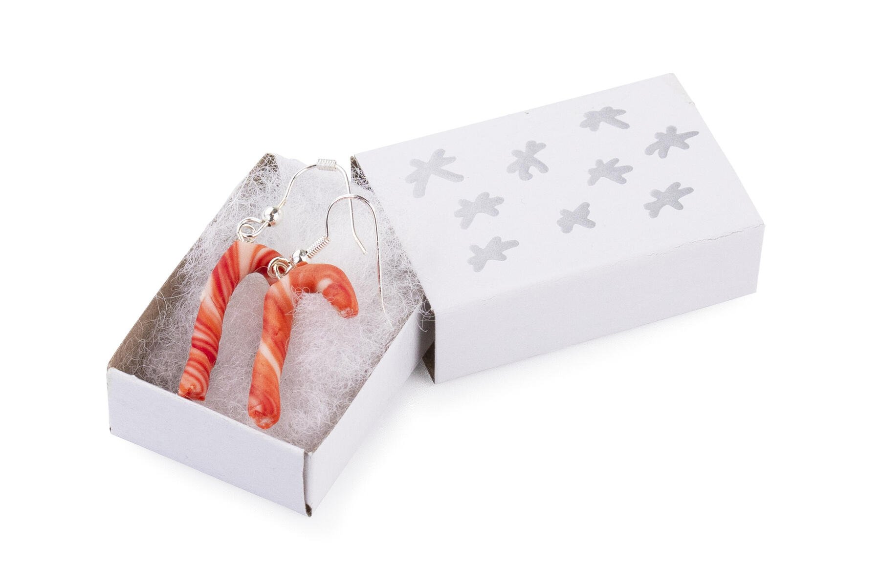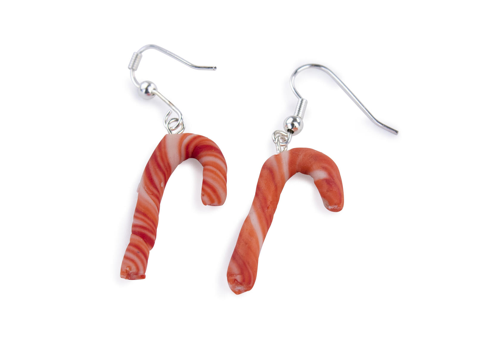 Karamellpinne: Forma en kort tjock rulle av vit lera. Rulla tunna strängar av röd lera och lägg utanpå den vita leran, rulla in och vrid leran för att få ett fint mönster som liknar polkagris. Gör små karamellpinnar. Stick in en liten hängögla som du knipsat av med en avbitartång. Härda sedan i hushållsugn enligt instruktionen på förpackningen.