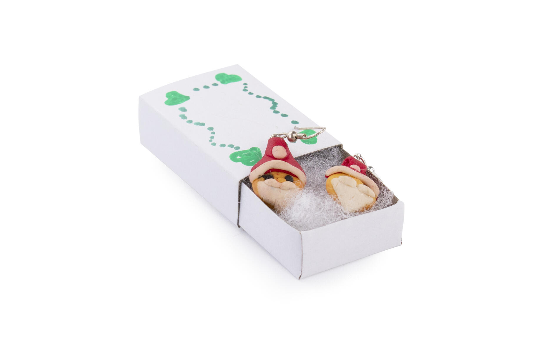 Tomte: Blanda till valfri hudfärg. Forma ett runt ansikte och bygg på vitt skägg, mustascher, näsa och ögon. Fortsätt med en röd luva med vit kant och sätt fast en hängögla upptill i luvan. Härda i hushållsugn.