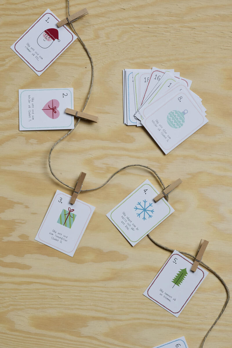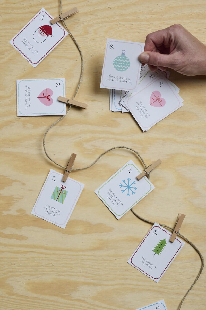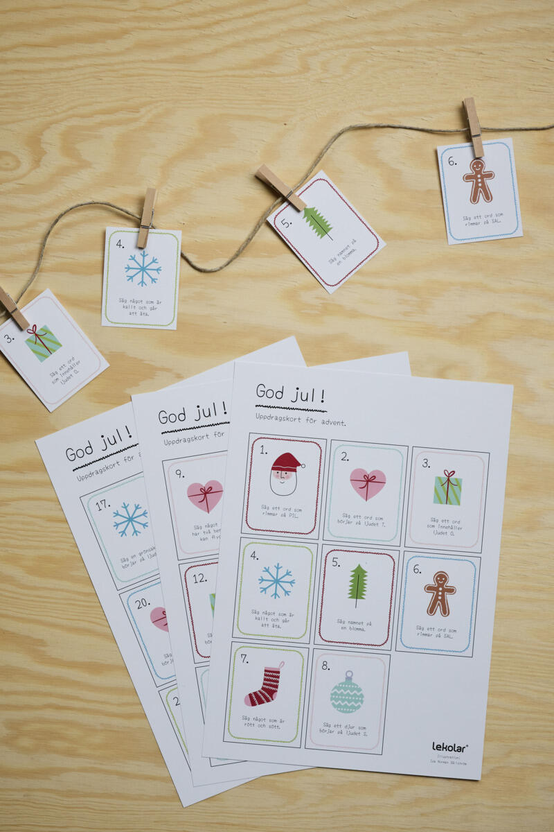 Klipp ut varje uppdragskort. Laminera om så önskas. Lägg korten i en hög och dra ett valfritt kort varje dag i december fram till julafton. Ni kan också följa numreringen och dra kortet märkt 1 den 1 december o.s.v. Uppmana barngruppen att göra det som står på kortet. Häng förslagsvis upp de kort som ni har klarat på väggen eller som en dekorativ girlang. Ett perfekt sätt att kombinera språkutveckling och jul!