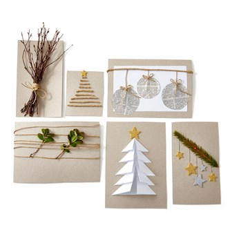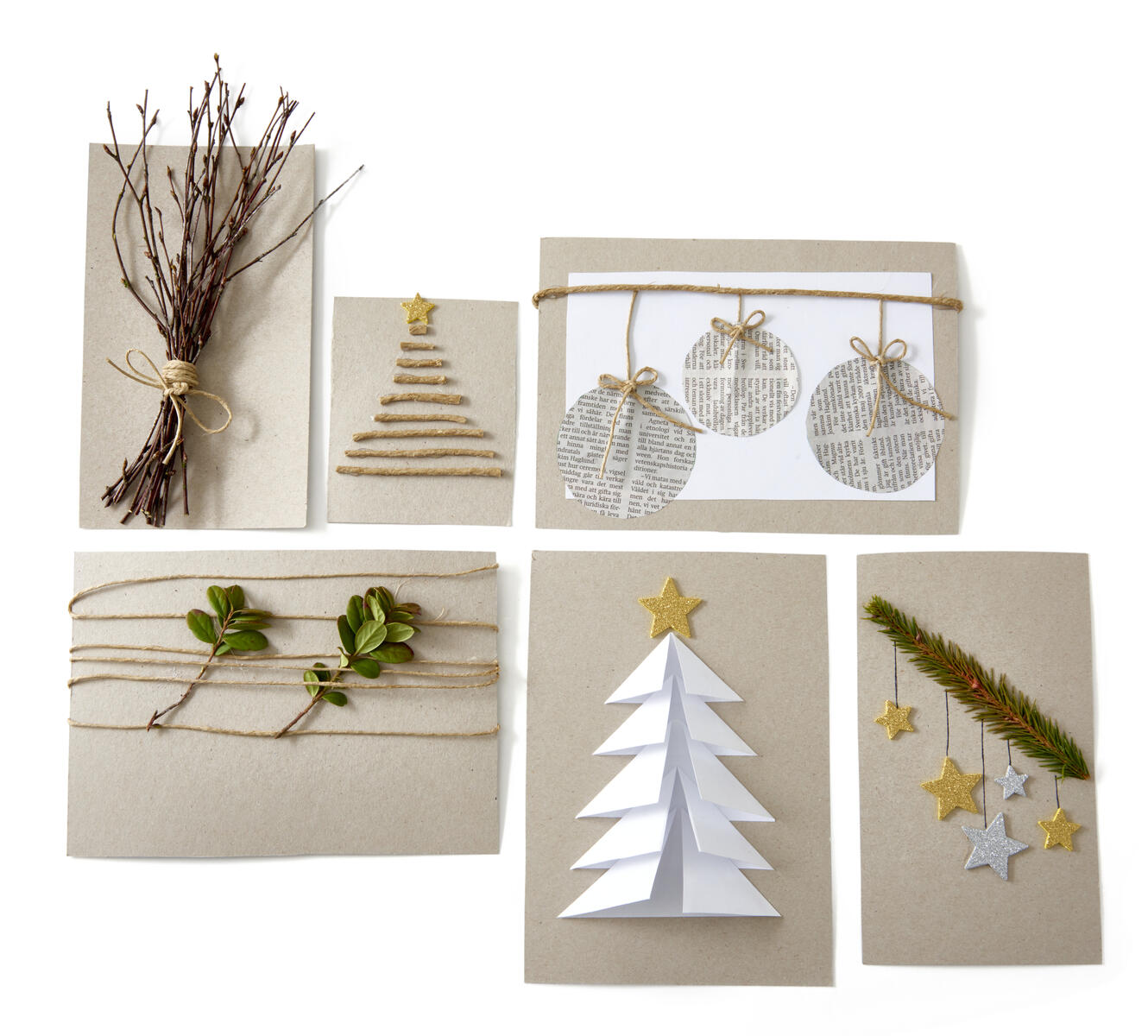 Börja med att klippa ut önskad storlek på dina julkort av kvistpapper. Kort med björkris: Ta ett knippe björkris och bind ihop med hampbindgarn. Limma fast knippet på julkortet. Kort med gran av hampabindgarn: Klipp ut olika långa längder av hampabindgarnet och limma fast det på kortet så den bildar en gran. Limma fast en stjärna längst upp på granen. Kort med julkulor: Klipp ut en lite mindre fyrkant än själva kortet i vitt papper och limma fast på kvistpappret. Klipp ut 3 olika stora cirklar ur en tidning som blir julkulorna. Limma fast kulorna på olika höjd. Limma fast ett hampabindgarn överst på kortet som du sedan drar garn mellan så det ser ut som kulorna hänger. Kort med lingonris: Vira hampabindgarn runt kortet och sätt fast lingonris i det. Kort med Julgran: Klipp ut 5 st rektanglar i 5 olika storlekar. Vik in rektanglarnas hörn mot mitten av rektangeln så de bildar trianglar. Börja uppifrån med den minsta triangeln och limma fast överst på kortet. Limma fast nästa triangels spets lite inne i den första triangelns nederdel och fortsätt på samma vis med alla trianglar tills du har formen av en gran. Limma fast en stjärna på toppen. Kort med Stjärnor: Limma fast en grankvist på tvären över ditt kort. Limma fast stjärnor i olika storlekar och dra ett streck med en penna mellan grankvisten och stjärnan så det ser ut som den hänger från grankvisten