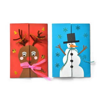 6. Det kan förbättra passformen om du limmar dit alla delarna på högra och vänstra halvan och sedan klipper i mitten så att kortet går att öppna. Snögubben har fått ett randigt snöre rsom halsduk, som också fungerar som stänganordning till kortet.