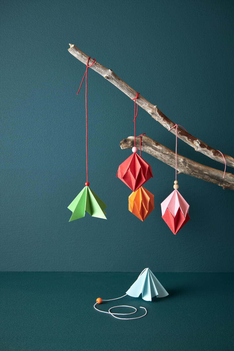 - Gör ett hål i den ena pappersvikningen och trä igenom ett snöre att hänga den med.