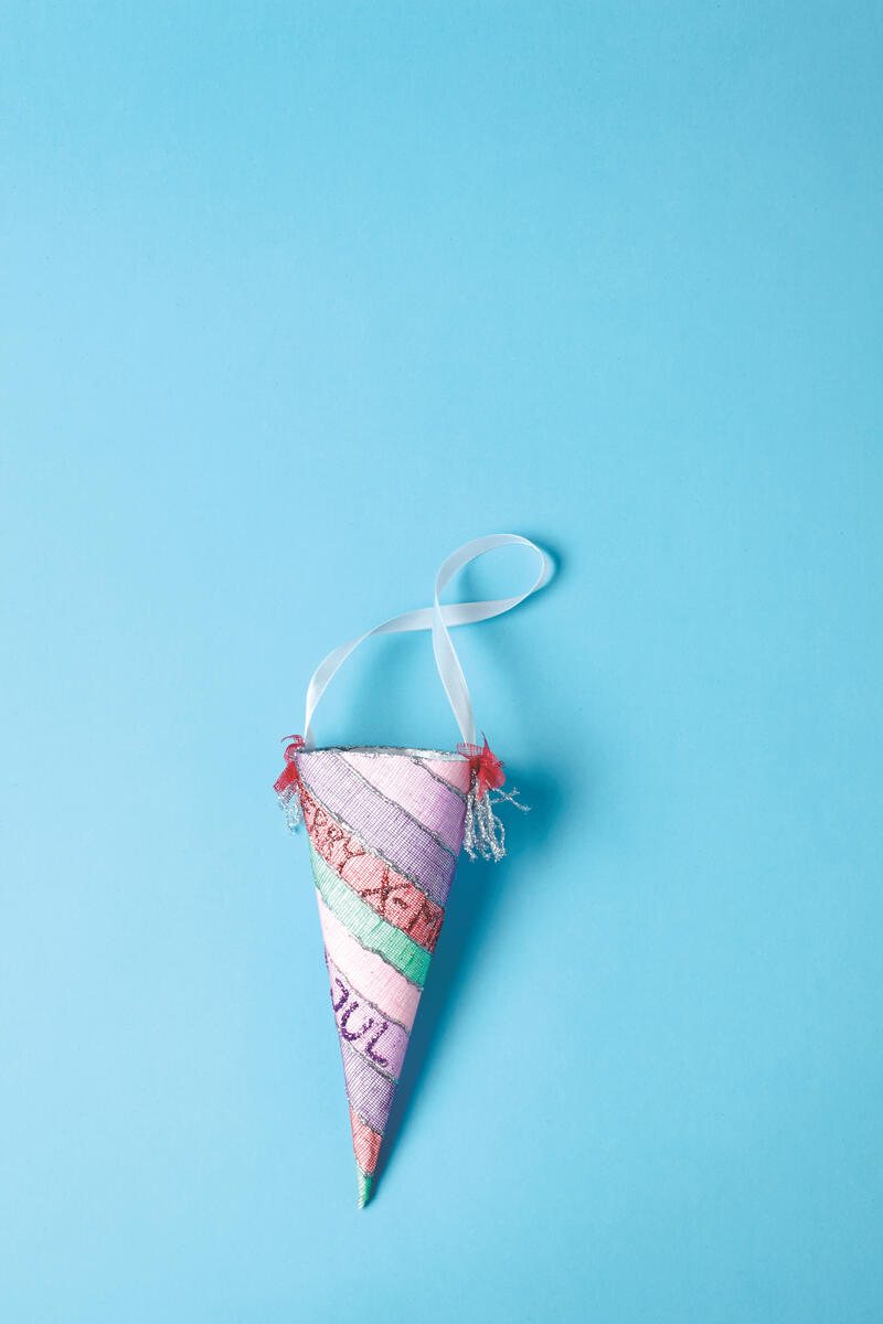 Utgå från en uppochnedvänd pappkon. Måla och dekorera den efter eget tycke. Limma dit bandet på konen för en snygg upphängning. Inte en julstrut kommer vara den andra lik.