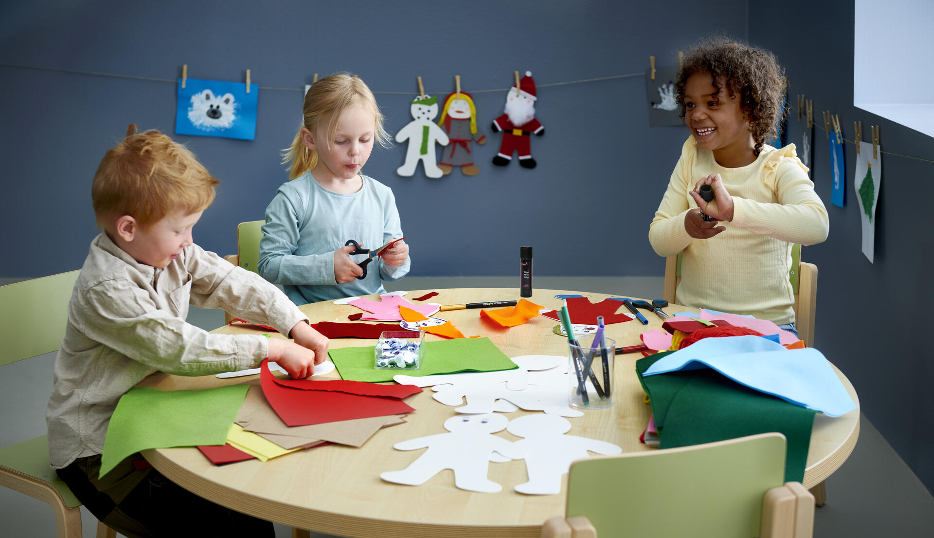 - Klistra sedan upp alla figurer på väggen eller låt barnen hänga dem i granen.