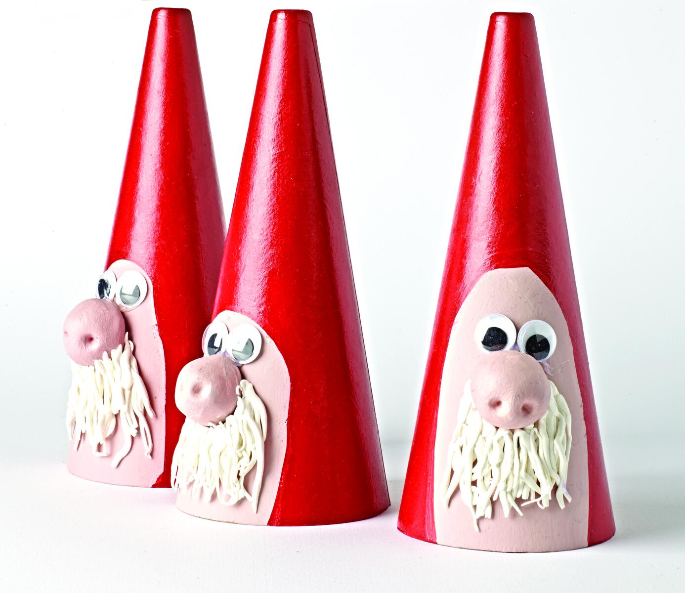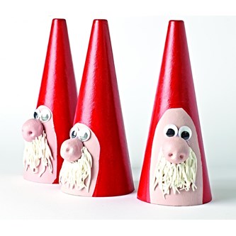 Måla pappkonen i önskad färg. Gör detaljerna såsom skägget och näsan i lera och låt torka. Måla det sedan om det behövs. Limmas sedan fast delarna och ögon på pappkonen.