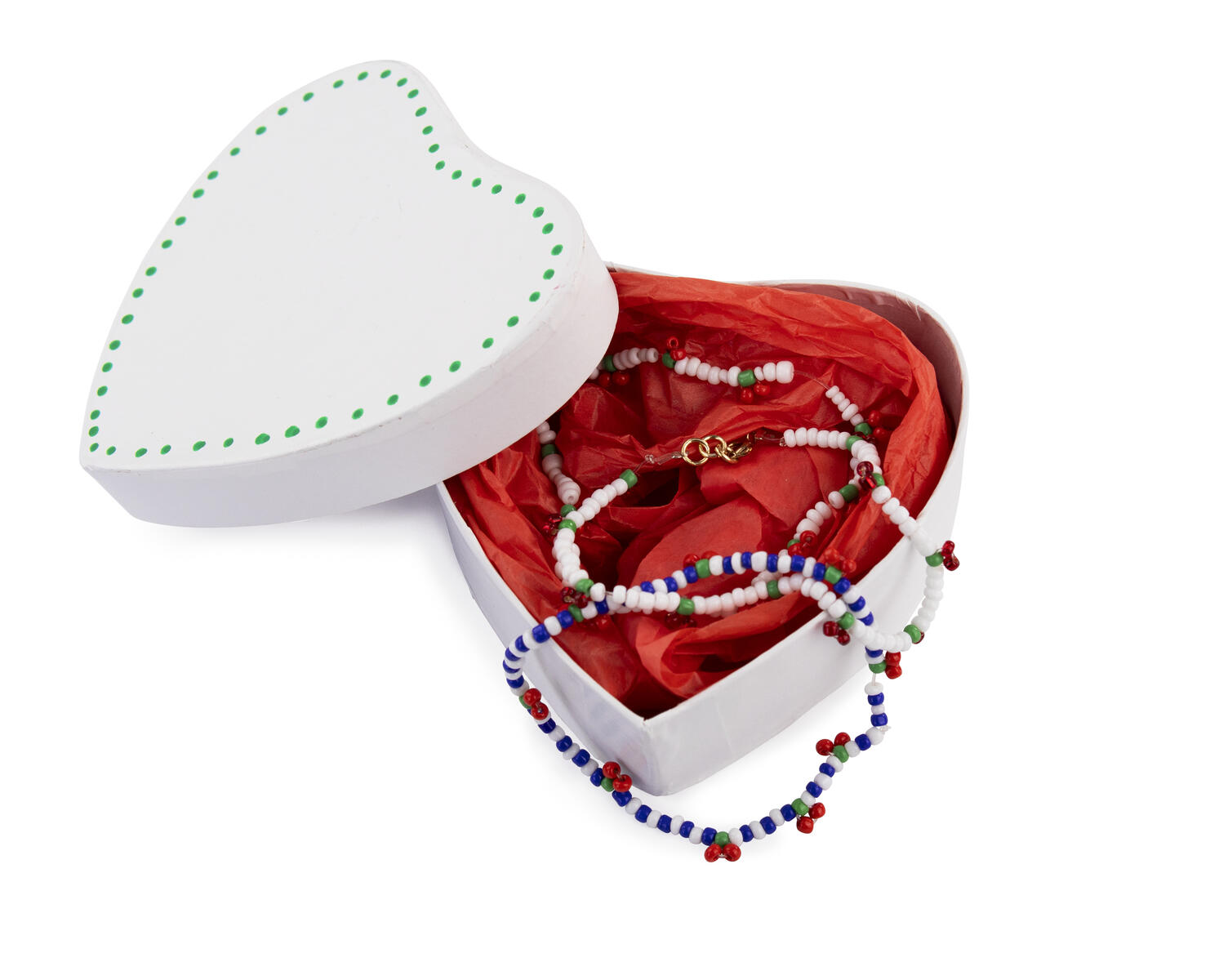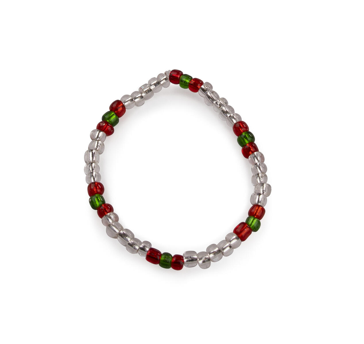 - Trä det elastiska snöret genom den gröna pärlan två gånger och dra åt snöret så att de två röda pärlorna hamnar på utsidan av den gröna pärlan.