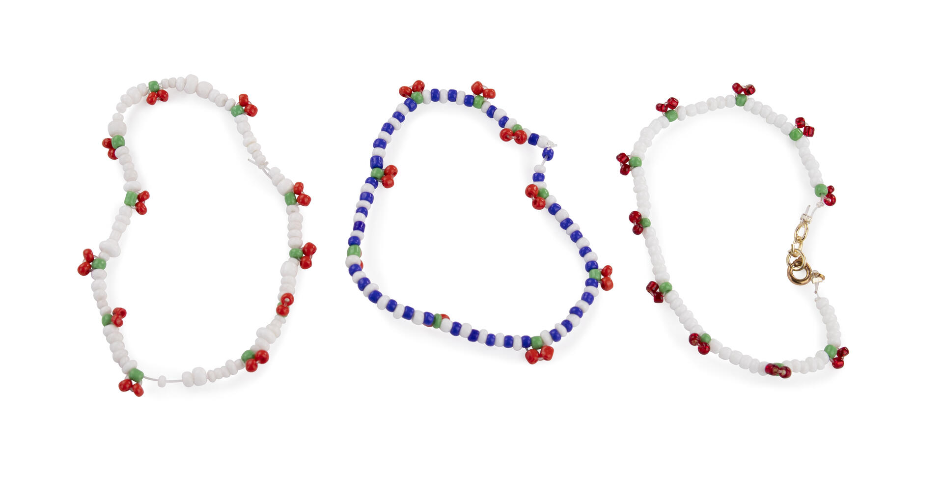 - Placera fem vita pärlor mellan varje körsbär, använd en grön och två röda pärlor.