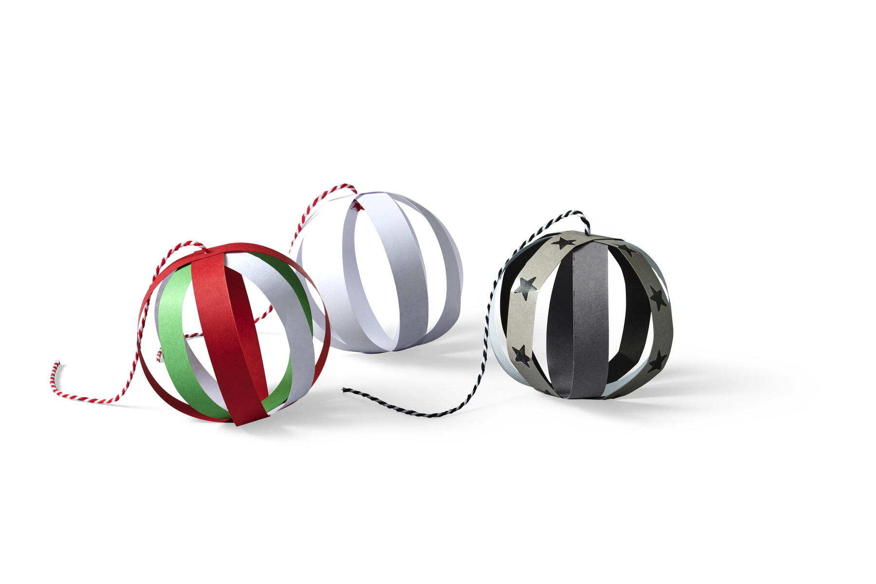 Klipp till 3 strimlapapper, ca 26 cm. Markera mitten och limma dem något korslagda. Vik upp varje ände till toppen av bollen och limma dem ”lager på lager”. När bollen har torkat, trä i ett band för upphäng (ta hjälp av en stoppnål).