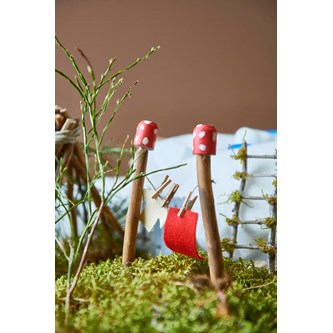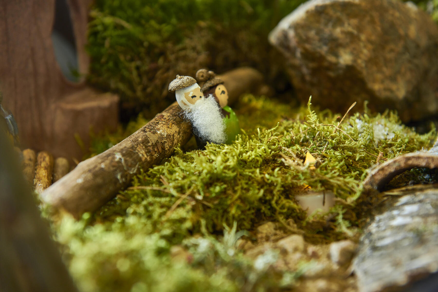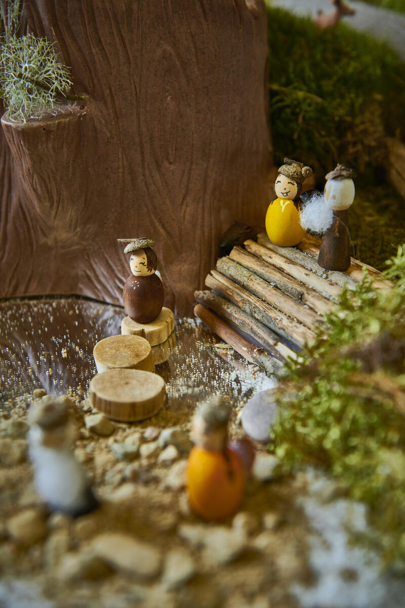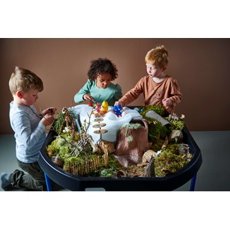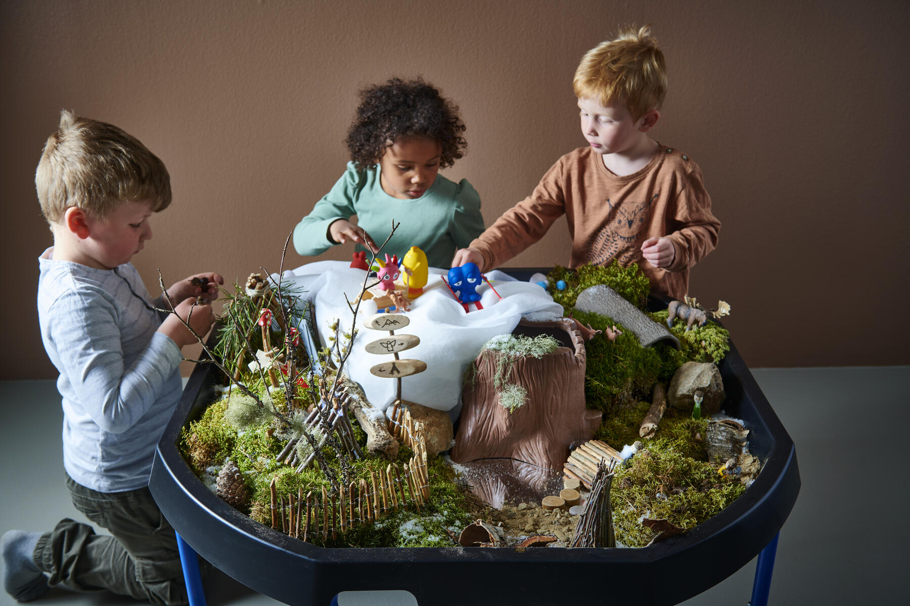 Få saker är så fascinerande som minivärldar. Att få skapa små hem och annat spännande för figurer, djur eller andra väsen är spännande och ”pyttigt” och även lite pilligt. Här har vi skapat tre vintriga minivärldar på ett och samma lekbord. Det är Babblarnas skidbacke, féernas och tomtarnas dal samt en lite större värld för… ja, vem då? Vi utgick från lekbordet Art.nr: 53200 och samlade därefter ihop en mängd naturmaterial såsom mossa, stenar, kottar och grenar. Som vatten/is använde vi oss av Art.nr: 114100 Plastspegel 12 st eller liknande. Till pyssel och världar har vi, förutom naturmaterial, använt oss av följande produkter: