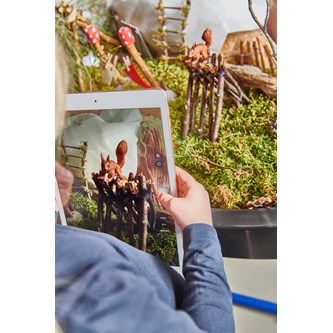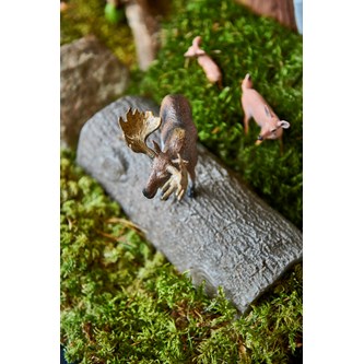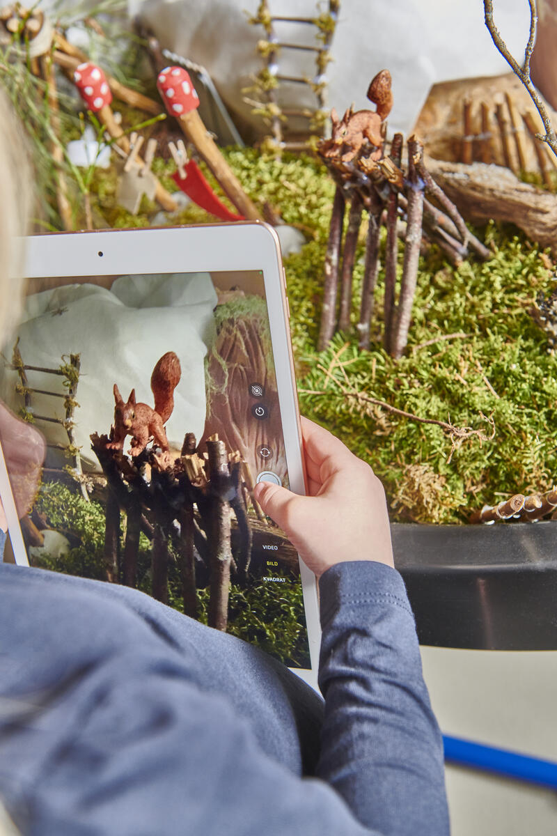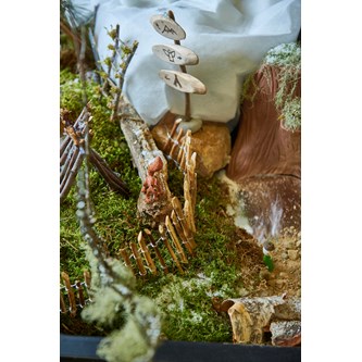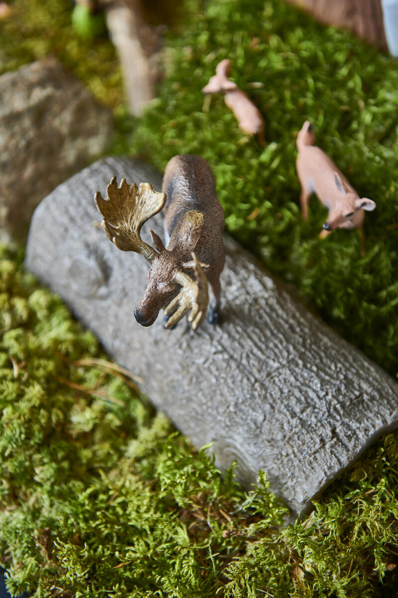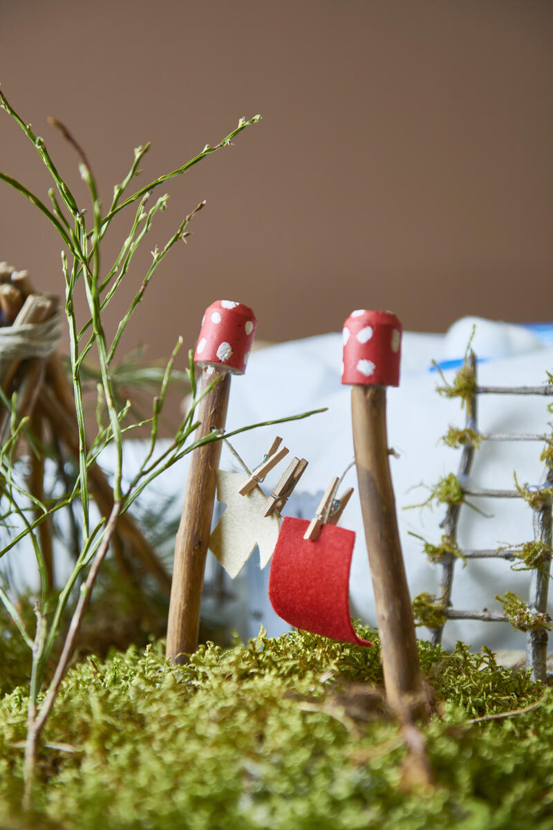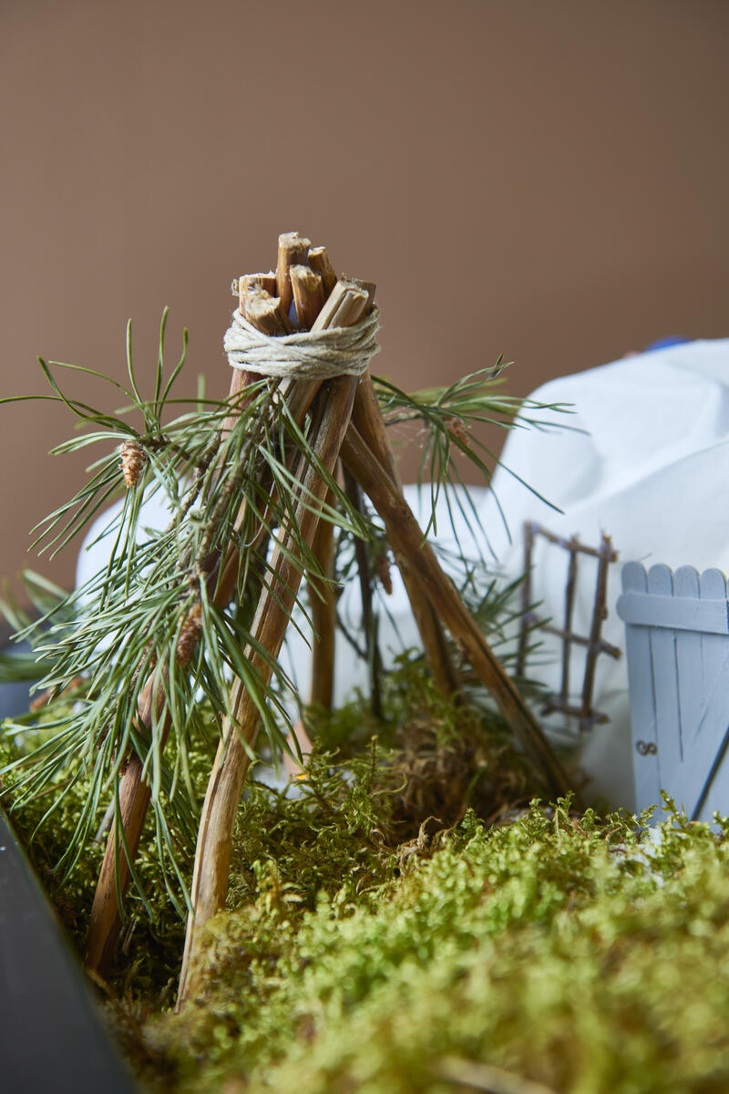 Få saker är så fascinerande som minivärldar. Att få skapa små hem och annat spännande för figurer, djur eller andra väsen är spännande och ”pyttigt” och även lite pilligt. Här har vi skapat tre vintriga minivärldar på ett och samma lekbord. Det är Babblarnas skidbacke, féernas och tomtarnas dal samt en lite större värld för… ja, vem då? Vi utgick från lekbordet Art.nr: 53200 och samlade därefter ihop en mängd naturmaterial såsom mossa, stenar, kottar och grenar. Som vatten/is använde vi oss av Art.nr: 114100 Plastspegel 12 st eller liknande. Till pyssel och världar har vi, förutom naturmaterial, använt oss av följande produkter: