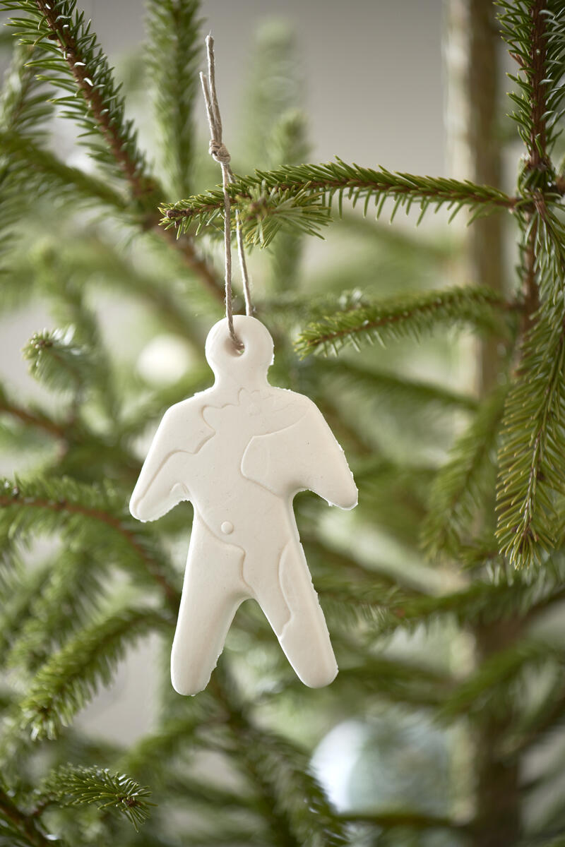 - Kavla lera. Lägg önskat material ovanpå leran och kavla ner alternativt tryck ner materialet i leran. Vi har använt bland annat spetsduk och kottar. Ta bort materialet. Tryck ner önskad julform och ta bort överbliven lera. Ta ut leran ur formen. Gör ett hål i ovankanten. Trä igenom ett garn så att alstret går att hänga.
