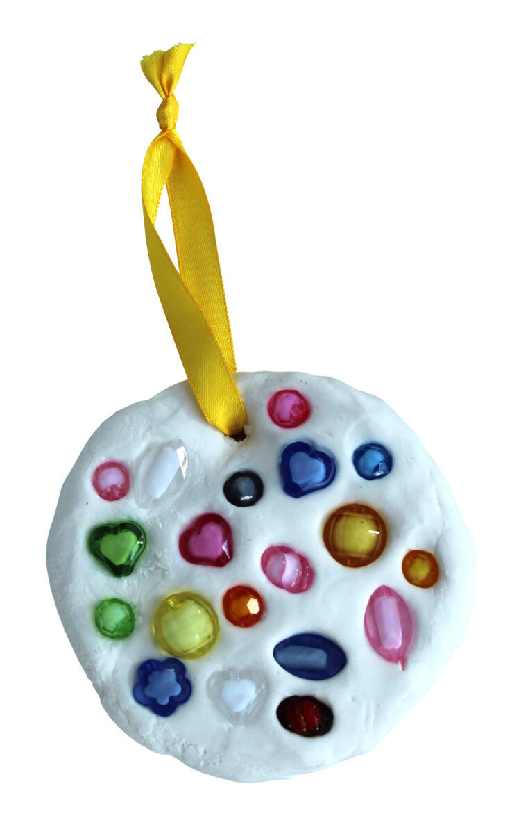 - Tryck i valfri mängd kristallstenar i leran och stansa ett hål i toppen. Låt torka.