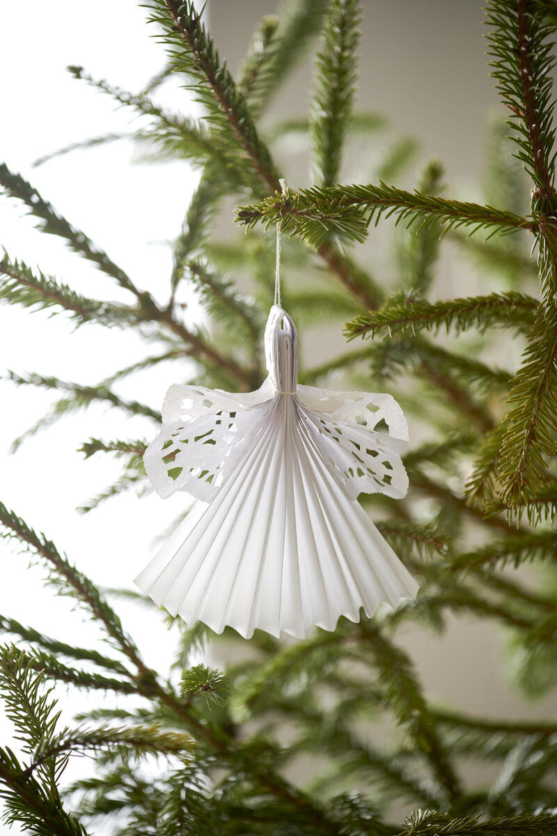 Vinkla ut spetspappret till vingar och bred ut det veckade papperet till klänning.