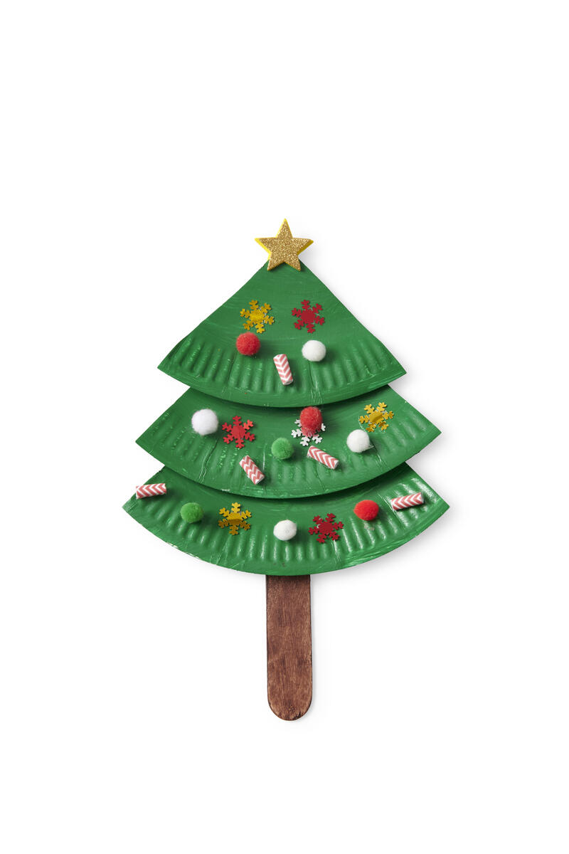 6. Dekorera granen med pärlor, glitter och puffy poms och sätt stjärnklistermärken i toppen.