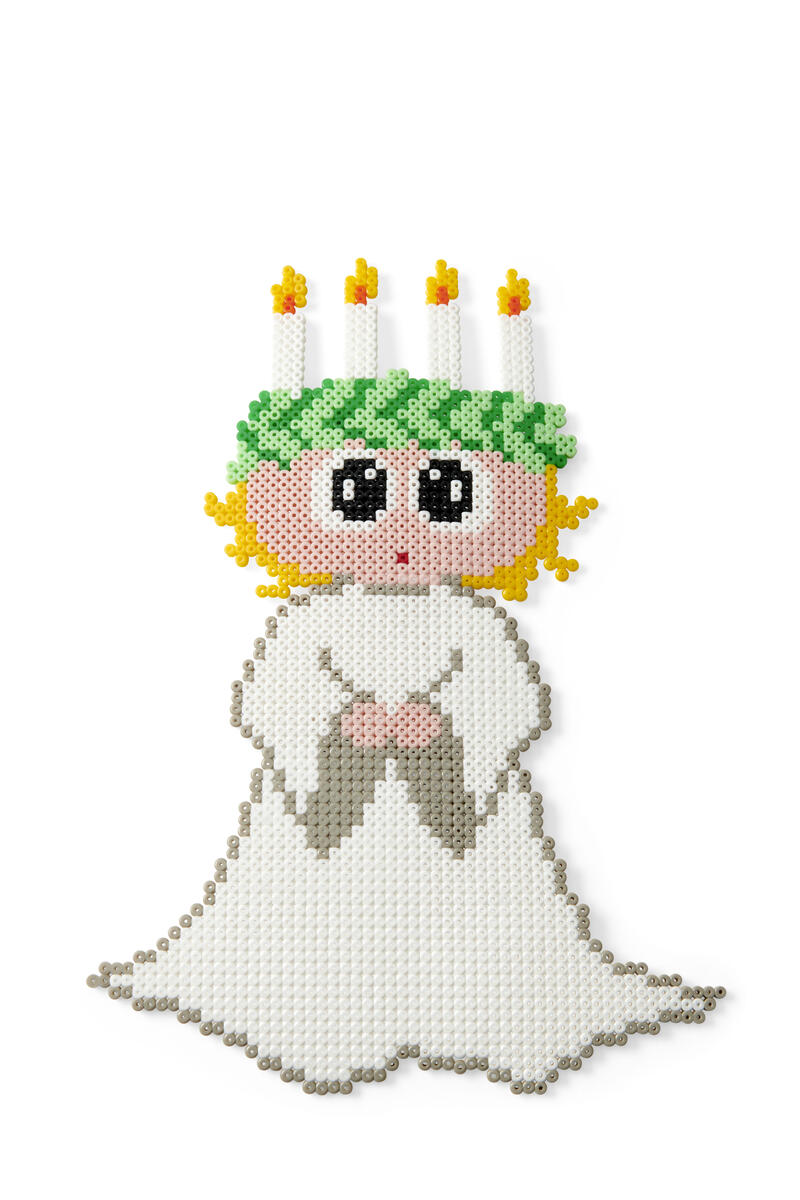 - Stryk ihop pärlorna med ett bakplåtspapper mellan motivet och strykjärnet. Tänk på att stryka motivet långsamt och ganska länge så att pärlorna smälter ihop ordentligt, men se till att pärlorna inte smälter fast i plattan. Låt motivet svalna ordentligt innan det lossas från plattan. En strumpsticka är ett bra hjälpmedel för att lossa pärlade motiv från underlaget.
