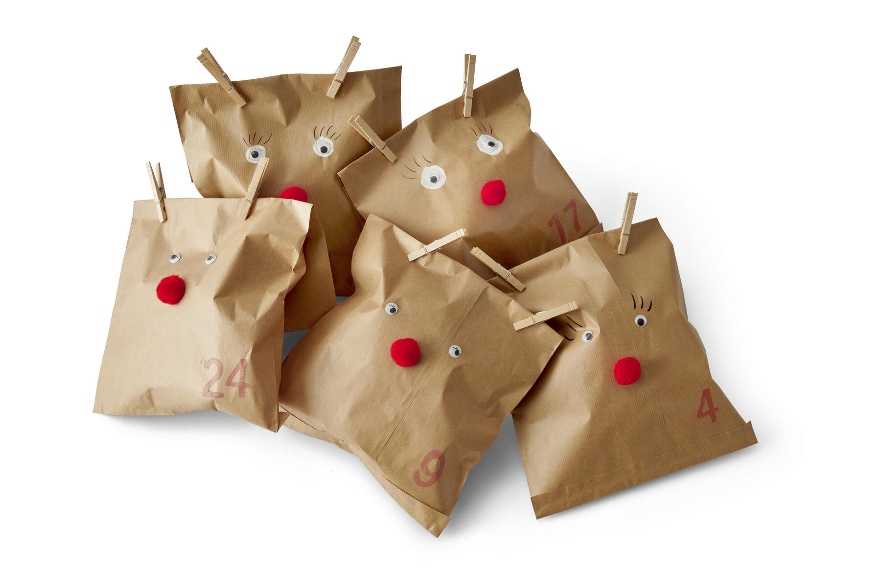 24 stycken bruna papperspåsar. Dekorera påsarna med siffror 1–24. Använd stämplar med siffror. Måla ögon eller använd färdiga plastögon och klistra på. Till den röda näsan tar man och klistrar röda pompoms och till horn klämmer man enkelt dit två tvättklämmor. Nu är det bara att fylla påsarna med överraskningar.