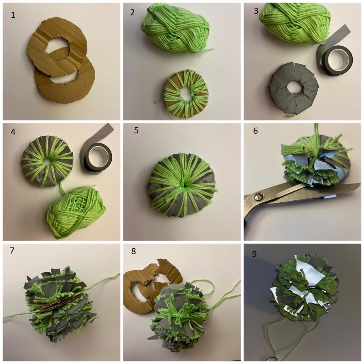 - Ta bort kartongcirklarna försiktigt och fluffa till bollen. Använd saxen för att snygga till i kanterna så den blir jämn.