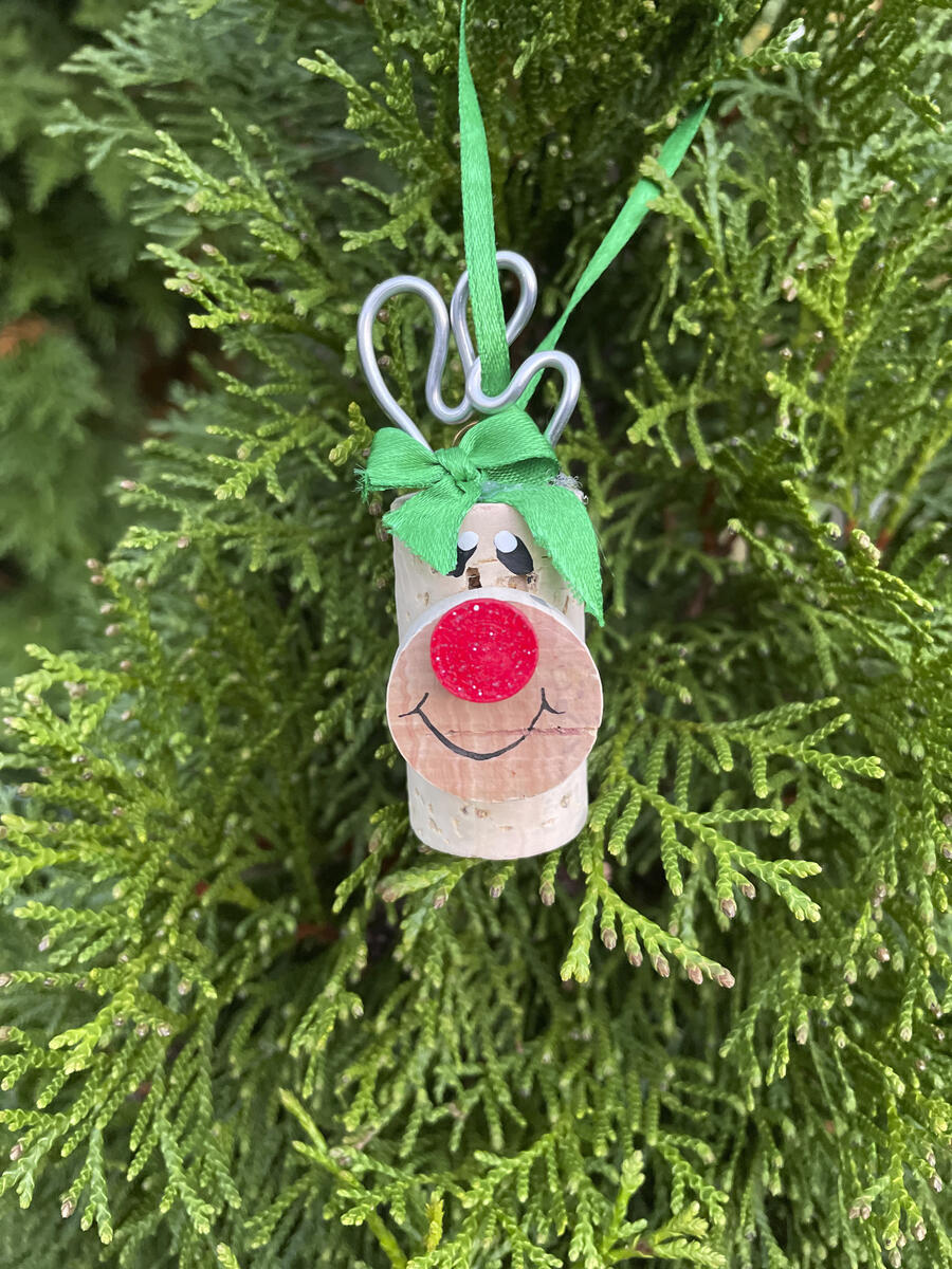 - Gör en ögla av grönt band och limma fast på korken till upphängning