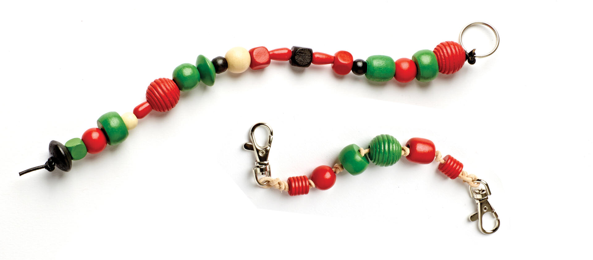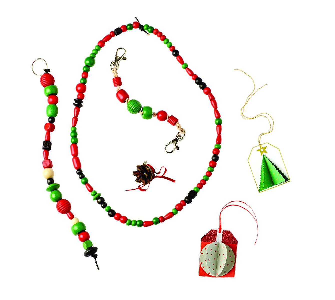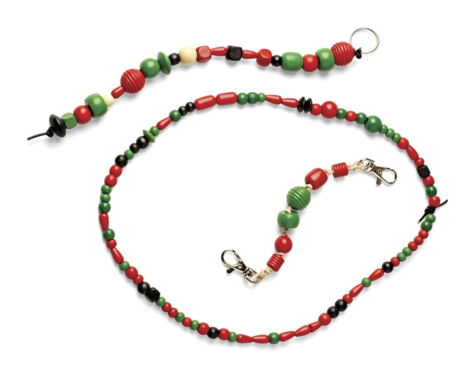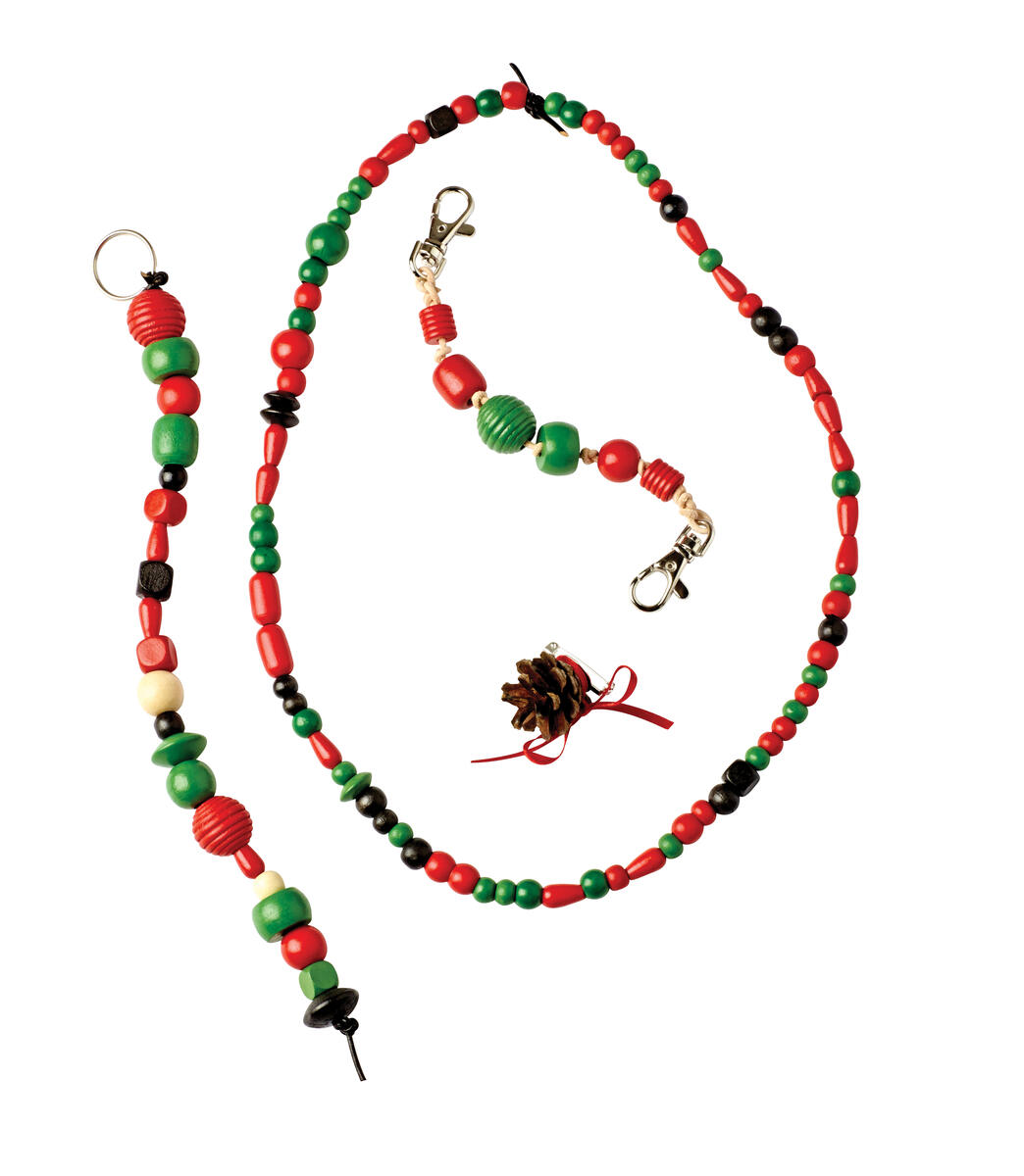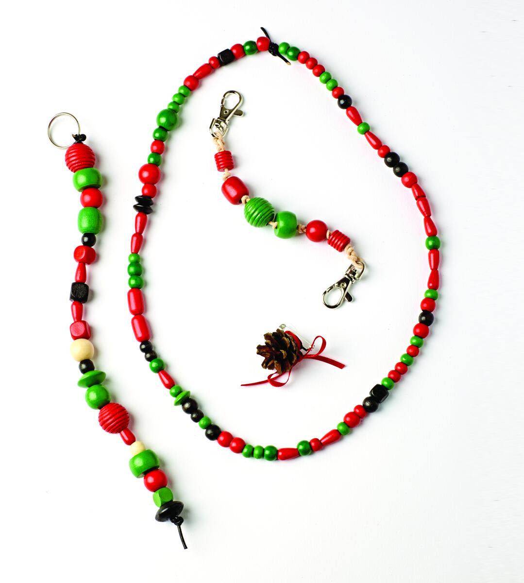 Halsband; Trä pärlor på resårsnodden. När halsbandet är i den längd du önskar, knyt ihop ändarna.
