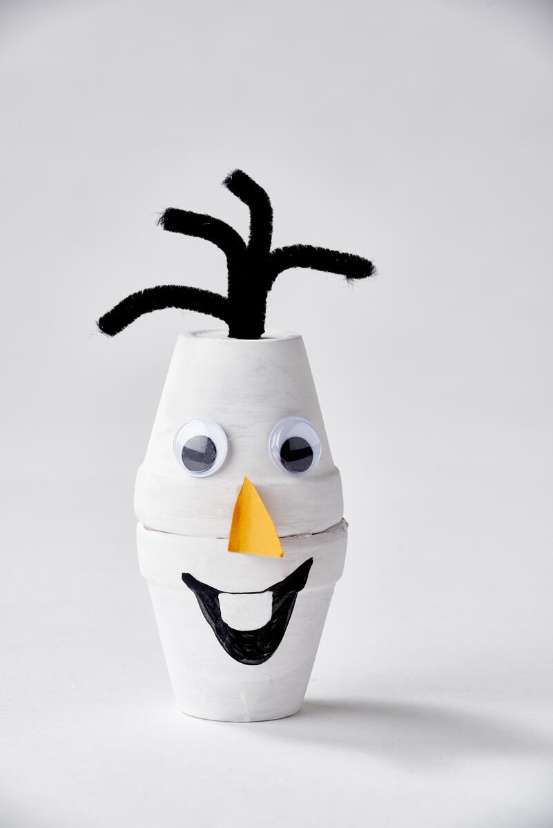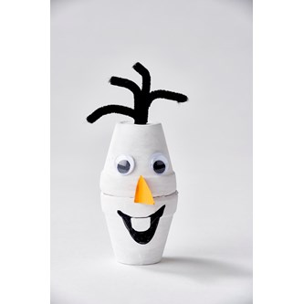 Tryck ner piprensare i hålet på krukan. Denna blir hår på snögubben.