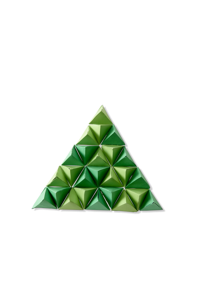 Klipp ut en stor triangel. Använd linjal och och skrapkniv för att dra linjer diagonalt i form av tre trianglar. Se mallen!