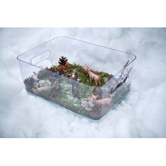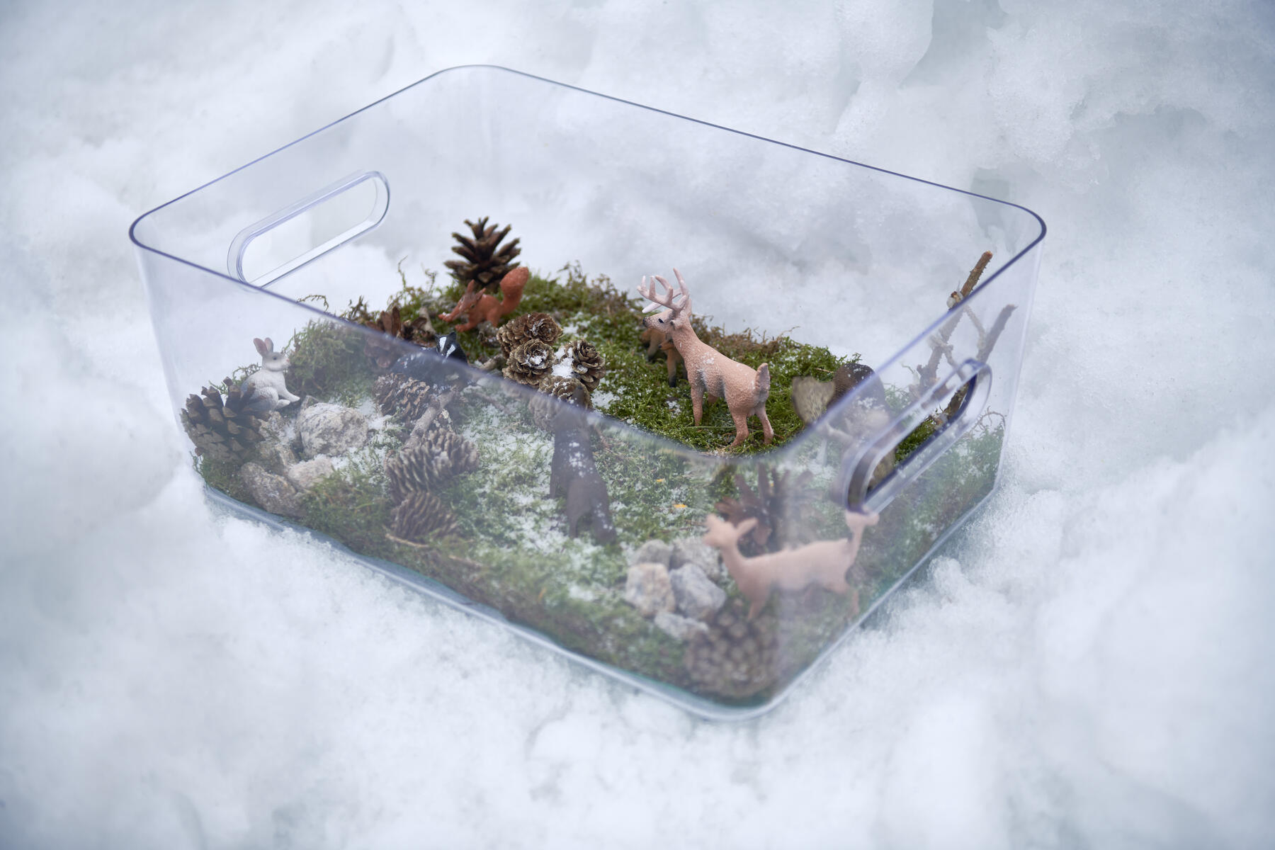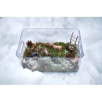 - Placera skogsdjur i lådan och pudra över lite låtsassnö i lådan.