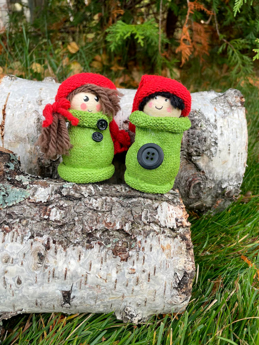 - Klipp en bit röd tubstickad klädsel och limma fast som mössa.