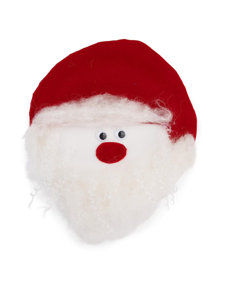 - Skissa upp/markera ansiktet under tomteluvans kant, och klipp sedan ut en röd tomtenos av tyget. Måtta in ögon och nos på tallriken, och riv sedan av två vaddstrimlor – en till tomteluvans kant och en till skägget.