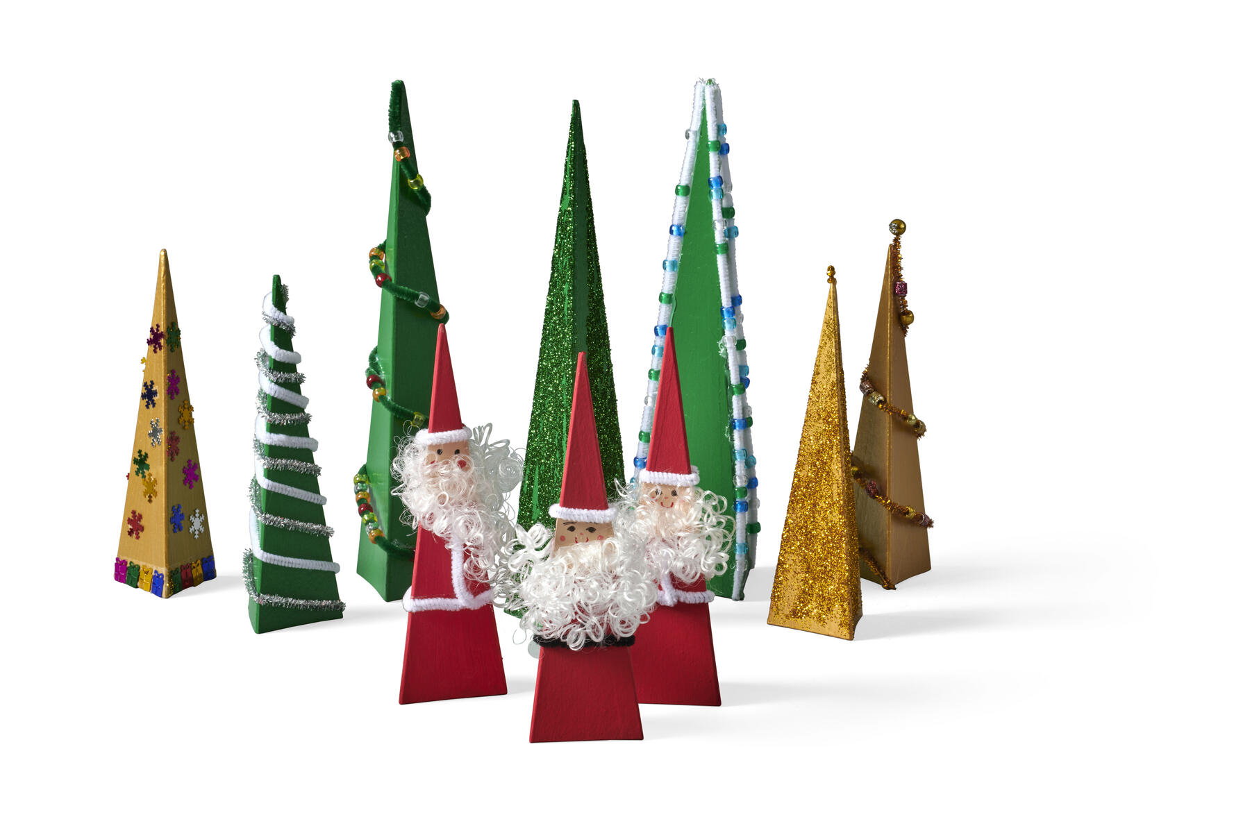 - För tomte - använd vit piprensare för att markera tomteluvans storlek och tomtedräkt. Klipp ut en halvcirkelformat papper för ansikte och klistra fast på den rödmålade konen. Rita dit ögon, näsa och mun. Klistra sedan på tomteskägg.